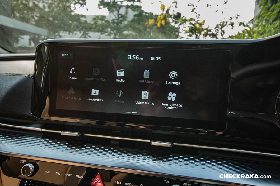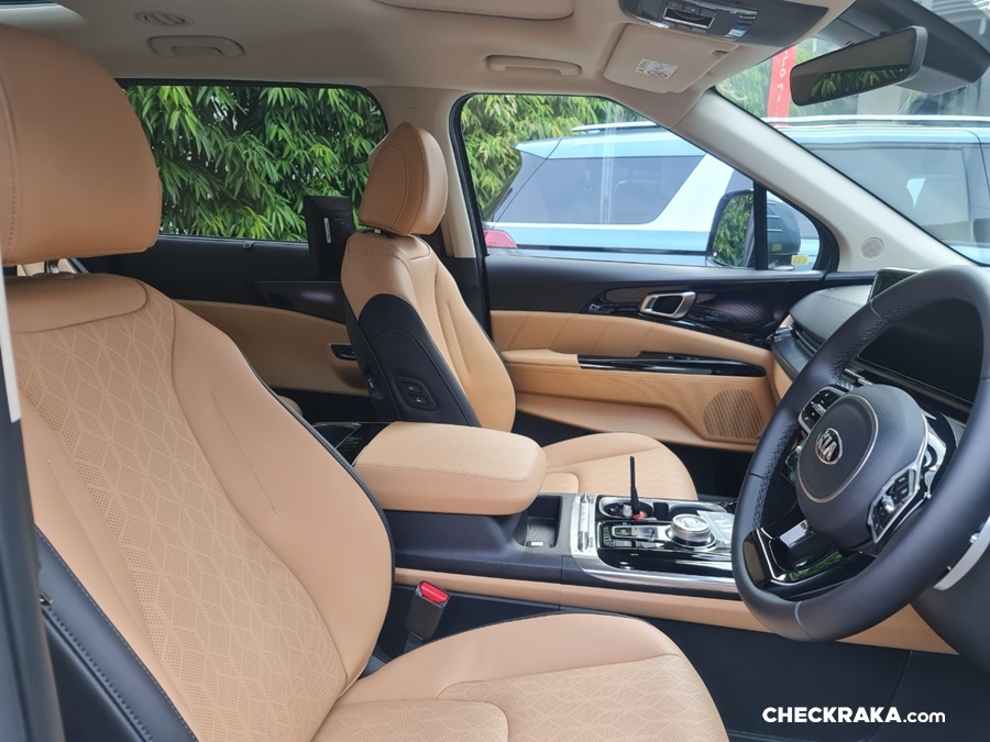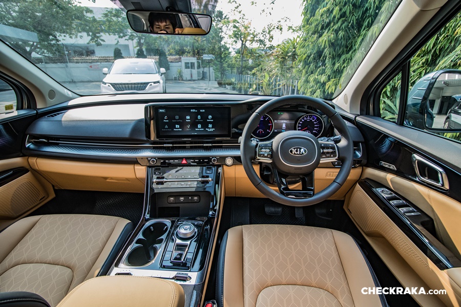 ภายใน เบาะสีทูโทนสีน้ำตาล Saddle Brown ตัดขอบดำ ทั้ง 2 รุ่น จอทัชสกีนหน้าจอ 12.3 นิ้ว รองรับแอนดรอย์และ iOS มี wifi ให้ลูกคุณดู Baby Shark ได้สบายๆ จากจอหลังเบาะ (เพราะลิขสิทธิ์แท้จากเกาหลีมาเลย) เครื่องเสียงจาก BOSE (รุ่น SXL) ที่มาพร้อมกับลำโพงTweeter และSub-woofer รวมทั้งหมด 12 ตำแหน่ง รุ่น EX เครื่องเสียงธรรมดา ลำโพง 6 ตัว แต่ก็เร้าใจไม่แพ้กัน รีโมทสตาร์ท เปิดแอร์ได้ในระยะราวๆ 20 เมตร หรือใครจะลองไกลกว่านี้ก็จัดไป