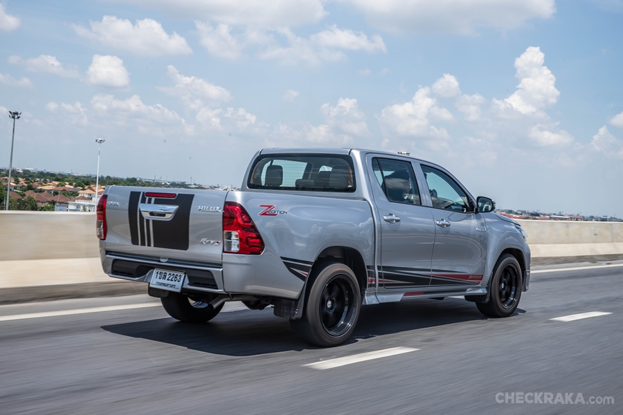จากการขับทดสอบระยะทางรวมไม่ต่ำกว่า 500 กม. เน้นทั้งในและนอกเมือง พอสรุปความแตกต่างจากที่ผู้เขียนเคยขับไฮลักซ์ รีโว่ มาหลายทริปทั้งทางไกลระดับ AEC 3 ประเทศ และทริปโหดอย่าง กรุงเทพฯ-เวนิช เส้นทางช่วงประเทศ จีน-อุซเบกิสถาน หรือในประเทศ ซึ่งผ่านการพิสูจน์และมั่นใจในสมรรถนะตัวรถ ตลอดจนขุมพลังมาเป็นอย่างดี สำหรับ Z edition ที่เป็นขับสอง ความสูงปกติ แนวคิดคือ ใช้งานได้หลากหลายดีเหมือนเดิม แต่สามารถนำไปตกแต่งสไตล์เรซซิ่ง ตอบโจทย์สายกระบะเฟอร์ฟอร์มานซ์ที่กำลังนิยมและมีของเล่นในตลาดมากมายได้ด้วย ผู้เขียนได้รับข้อมูลเบื้องต้นจากทีมงานโตโยต้าว่า รถรุ่นนี้ Double Cab Z Edition 4x2 2.4 Mid เกียร์แมนนวล 6 สปีด นอกจากภายนอกที่ต่างจากเดิมทีคุ้นเคยคือ ตัวถังกว้าง และมีชุดแต่ง RAZER แล้ว ได้มีการปรับเรื่องของช่วงล่างด้านหลังเฉพาะรุ่น 4 ประตู ตัวแหนบมี 3 แผ่น เน้นให้นั่งสบายมากขึ้น ที่พิเศษคือ เฉพาะคันทดสอบได้ติดตั้งกล่อง Ultra Boost จากทาง ECU SHOP และชุดล้อแม็กจากเลนโซ่เป็นยางแก้มเตี้ย เน้นฟิลสปอร์ตเต็มๆ