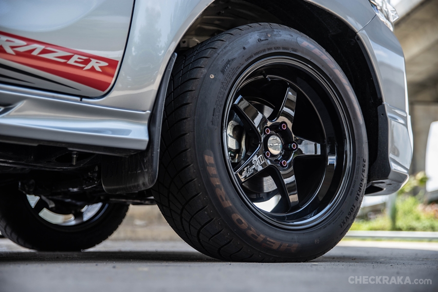 ตัวถังภายนอกมีการปรับเปลี่ยนที่ชัดเจนคือ โป่งล้อทั้งหน้าหลังที่กว้างขึ้นให้ลุคเหมือน รีโว่ ไวด์บอดี้ ดูดันพร้อมรับกับล้อ-ยางหน้ากว้าง สำหรับคันนี้ที่มีการติดตั้ง RAZER PACKAGE เพิ่มทำให้ตัวรถดูสปอร์ตและเต็มรอบด้านมากขึ้นด้วยสเกิร์ตรอบคัน และมีลวดลายสติ๊กเกอร์คาดหน้าหลังและข้างครบ แน่นอนว่าดูซิ่งแตกต่างจากความเป็นสแตนดาร์ดทันที เมื่อมีโป่งขนาดใหญ่แล้วก็ต้องจัดชุดล้อกับยางหน้ากว้างมาเข้ากับรถ คันนี้ได้ชุดล้อเลนโซ่รุ่นพิมพ์นิยมของรถกระบะ โชว์ออฟเซ็ตลึกดุดัน ตัวล้อเป็นสีดำตัดกับตัวถังสีเงินได้เป็นอย่างดี ยางที่ใช้ก็เข้าชุดมากับล้อเลนโซ่เป็นยางหน้ากว้างขนาด 255/50 - 18 เท่ากันทั้งหน้า-หลัง โชว์ลายดอกยางสปอร์ตสุดๆ ให้ความนุ่มนวลและยึดเกาะดีทีเดียวด้วยค่าเทรดแวร์ต่ำไม่ถึง 200