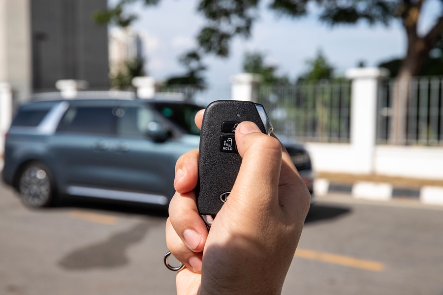 - กดปุ่มล็อคที่กุญแจรีโมท 1 ครั้ง ในระยะห่างจากรถไม่เกิน 10 เมตร - ภายในเวลา 4 วินาที หลังจากกดปุ่มล็อก ให้กดปุ่มสตาร์ทที่รีโมท ค้างไว้ 2 วินาที สัญญาณไฟฉุกเฉินจะกระพริบและเครื่องยนต์จะทำการสตาร์ท