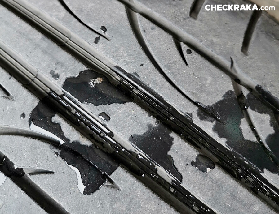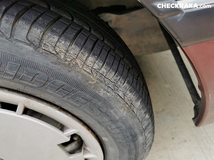 หากว่าใช้งานยางมาแล้วเกิน 2-3 ปี ในบางครั้งการดูผ่าน ๆ นั้นอาจยังเห็นว่ามียางดอกเต็ม และสึกหรอไม่มากนัก แต่ตัวเนื้อยางอาจจะแข็งหมดสภาพแล้ว หรือมีร่องรอยแตกลายงาหลบซ่อนอยู่ตามแก้มยาง ร่องดอกยาง หรือ ที่ดอกยาง ในบางจุดก็เป็นได้ เราจึงต้องตรวจละเอียดมากขึ้น เพราะถ้าเนื้อสัมผัสยางเริ่มแข็ง เมื่อเจอน้ำจะลื่นเป็นพิเศษเลย