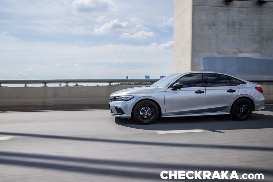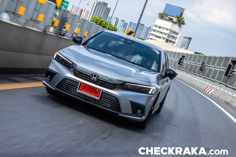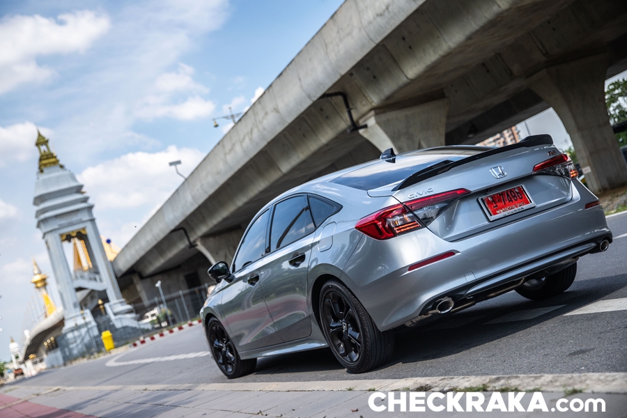 ผู้เขียนขับมุ่งหน้าเข้านนทบุรี เพื่อบันทึกภาพการขับต่อ ช่วงกลับเข้ากรุงเทพฯก็ได้ใช้เส้นทางด่วนพิเศษขับกลับ ระหว่างทางก็นึกถึงสิ่งที่อยากให้มีเพิ่มก็คือ การรองรับแอปพลิเคชันที่มากขึ้นไม่ว่าระบบ แอนดรอยด์ออโต หรือแอปเปิ้ลคาร์เพลย์ เช่น TomTom GO Navigation ไว้นำทางพร้อมรายละเอียดที่อัพเดท รวมทั้งการเตือนกล้องจับความเร็วด้านหน้า บอกตรงๆ ว่าการได้ขับซีวิคใหม่ที่มีพลัง 178 แรงม้า เทอร์โบบูสต์ให้รู้สึกตั้งแต่ 1,700 รอบต่อนาที มักทำให้ความเร็วไหลเกินที่กำหนดไปง่ายๆ ช่วงที่เส้นทางเปิดโล่งไร้รถด้านหน้า-หลัง ได้ลองเบรกชะลอหยุดจากความเร็ว 100 กม./ชม. น่าเสียดายที่ไม่มีเครื่องมือวัดจับเวลาเป็นตัวเลข แต่จากความรู้สึกเบรกหน่วงชะลอจนหยุดนิ่งให้พลังการจับและความรู้สึกตอบกลับที่ดีเกินคาด ถ้าเทียบกับรุ่นก่อนหรือรถผู้เขียนที่เบรกเป็นดิสก์ 4 ล้อ ยาง 17 นิ้วเหมือนกัน เมื่อขับมาถึงแจ้งวัฒนะก็มุ่งหน้าต่อไปนนทบุรีเพื่อบันทึกภาพการขับบนสะพานเพิ่มเติมและขับใช้งานในสภาพการจราจรหนาแน่นมากขึ้น พร้อมกันนี้ได้ลองปรับโหมดใช้งานทั้ง แบบประหยัด ปกติ และสปอร์ต สลับไปในหลายๆ ช่วง พบว่าชอบโหมดปกติยืนพื้น ถ้าต้องการเร่งหรือขับแบบสปอร์ตในรุ่น RS ก็มีแพดเดิ้ลชิฟต์ให้เลือกเปลี่ยนเกียร์ได้เอง ลองแล้วก็สะดวกสบายไม่ต้องละมือไปจากพวงมาลัยด้วย อย่างไรก็ตามการทดสอบในแบบวันเดียวก็ยังอาจไม่ได้ลึกซึ้งเสมือนการใช้งานจริงแบบในชีวิตประจำวันมากนัก ทั้งการขับเข้าตึก เลาะเลี้ยวถนนตรอกซอยในเมือง การเดินเบาขยับออกตัวนานๆ ฯลฯ แต่ก็พอได้ข้อสรุปที่น่าพอใจกับการขับเป็นระยะทางกว่า 280 กม. ถ้ามีข้อข้องใจก็น่าเป็นตำแหน่งเบาะที่วางใกล้พื้นรถเน้นความรู้สึกการขับแบบสปอร์ตและได้ค่าซีจีที่ต่ำ แต่นั่นทำให้ผู้เขียนเริ่มรู้สึกเมื่อยก้นหลังขับต่อเนื่องมานานๆ บางคนบอกเป็นเรื่องปกติ แต่ด้วยระยะทาง 200 กม. ขึ้นไปเทียบกับรถซีดานผู้เขียนกลับไม่เป็นเช่นนั้น น่าจะมาจากความหนาของตัวเบาะรองนั่งที่เน้นความสปอร์ตด้วย จุดนี้จริงๆก็แล้วแต่คนด้วย โดยรวมแล้วก็ประทับใจกับสมรรถนะการขับ รวมทั้งฟีเจอร์ และระบบช่วยเหลือ ความปลอดภัยของฮอนด้าซีวิคใหม่รุ่น RS