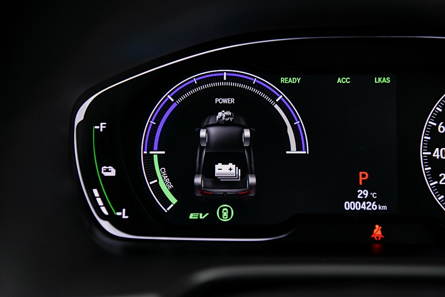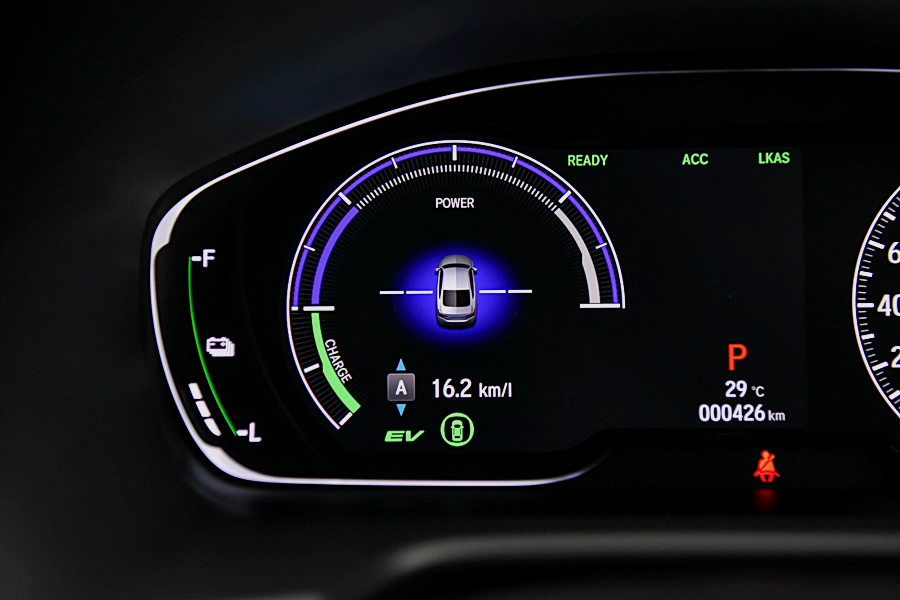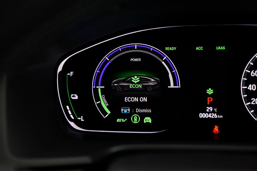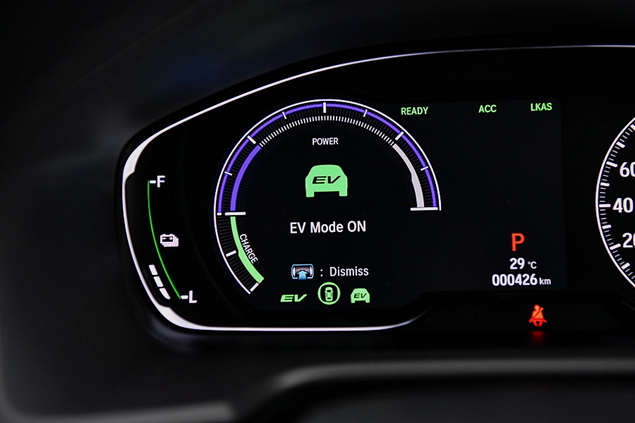 เน้นความประหยัดต้องไปที่ "โหมดการขับขี่ด้วยมอเตอร์ไฟฟ้า (EV Drive Mode)" ขับเคลื่อนด้วยมอเตอร์โดยใช้พลังงานไฟฟ้าจากแบตเตอรี่ และในขณะลดความเร็วจะเปลี่ยนพลังงานที่เกิดจากการลดความเร็วให้กลับเป็นพลังงานไฟฟ้า และชาร์จไฟกลับไปยังแบตเตอรี่ ระบบนี้จะให้ทั้งสมรรถนะการขับขี่และความเงียบเช่นเดียวกับรถยนต์ไฟฟ้า เหมาะกับการขับขี่ในเมือง โดยแบตเตอรี่ที่ได้รับการพัฒนาให้ดีขึ้นสามารถขับขี่ในโหมดมอเตอร์ไฟฟ้า (EV Drive Mode) ได้อย่างต่อเนื่องและทำความเร็วได้สูงสุดถึง 130 กม./ชม. โดยในวันทดสอบขับความเร็วสูงสุดในโหมด EV ได้ประมาณ 90 กม./ชม. เท่านั้นเนื่องจากสภาพเส้นทางและการจราจรในวันทดสอบไม่เอื้ออำนวยครับ