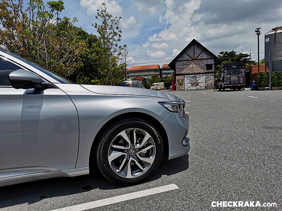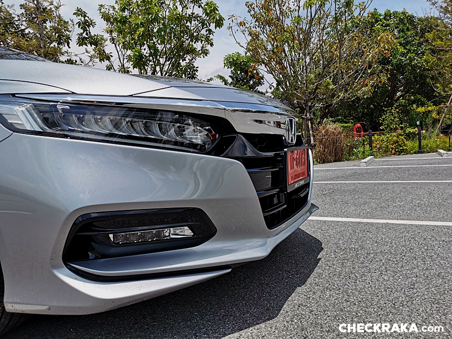 Honda Accord e:HEV TECH ราคา 1,799,000 บาท ภายนอกยังไม่มีเปลี่ยนแปลงมากนักเพิ่มโลโก้ H Mark ตกแต่งกรอบสีฟ้า และสัญลักษณ์ e:HEV ที่ด้านท้าย สปอยเลอร์หลังเล็ก ๆ แบบ ตูดเป็ด ซันรูฟพร้อมระบบ One-Touch และล้ออัลลอย 18 นิ้ว