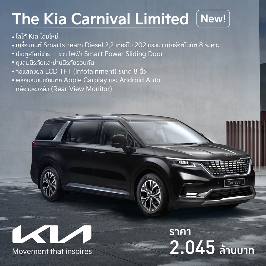 New KIA Carnival รถยนต์ครอบครัวมาพร้อมฟังก์ชั่นการใช้งานที่แสนสะดวกสบาย ทั้งระบบประตูสไลด์ไฟฟ้า รีโมทสตาร์ทและเปิด-ปิดประตู รองรับทุกการเชื่อมต่อความบันเทิงและความปลอดภัยเต็มคัน ขุมพลังดีเซล 2.2 ลิตร 202 แรงม้า เกียร์อัตโนมัติ 8 จังหวะ แรงและประหยัดเกินพอกับการใช้งานทั้งในและนอกเมือง
