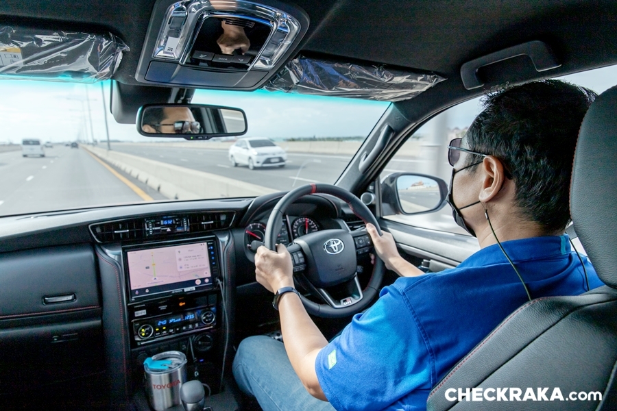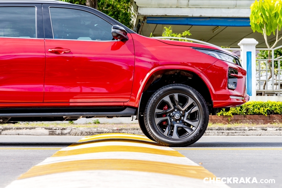 เครื่องยนต์แรงบวกกับระบบช่วงล่างที่มาพร้อมสปริงที่ปรับความแข็งเพิ่มขึ้นประมาณ 17% และโช้คโมโนทูบที่ให้ความหนึบและแน่นกว่าโช้คแบบฟอร์จูนเนอร์รุ่นปกติ ยิ่งมั่นใจ ขึ้นอย่างชัดเจนที่ความเร็วสูง ๆ อาการแกว่งหรือโยนน้อยลง แต่ก็ยังพอมีอยู่บ้างตามปกติของรถยกสูง แม้ว่าในความเร็วต่ำก็มีอาการเด้งบ้างแต่ไม่ถึงกับขับเหนื่อยหรือจุก เพราะเวลากระโดดคอสะพานจะมีแรงดีดเล็กน้อย แต่เมื่อรถยุบตัวลงกลับนุ่มนวล นับว่าคนขับสนุกวิ่งผ่านทางขรุขระได้โดยคนนั่งไม่บ่นครับ ส่วนน้ำหนักของพวงมาลัยยอมรับว่าเบากว่าในรุ่นก่อนไนเมอร์เชนจ์ตอนเปิดตัวใหม่ ๆ และให้ความกระชับซึ่งอาจเป็นเพราะได้ช่วงล่างดีขึ้นเฟิร์มขึ้น แต่ก็ยังมีน้ำหนักในความเร็วต่ำ ๆ อยู่บ้างตามกลไกของพวงมาลัยระบบน้ำมันไฮดรอลิกส์