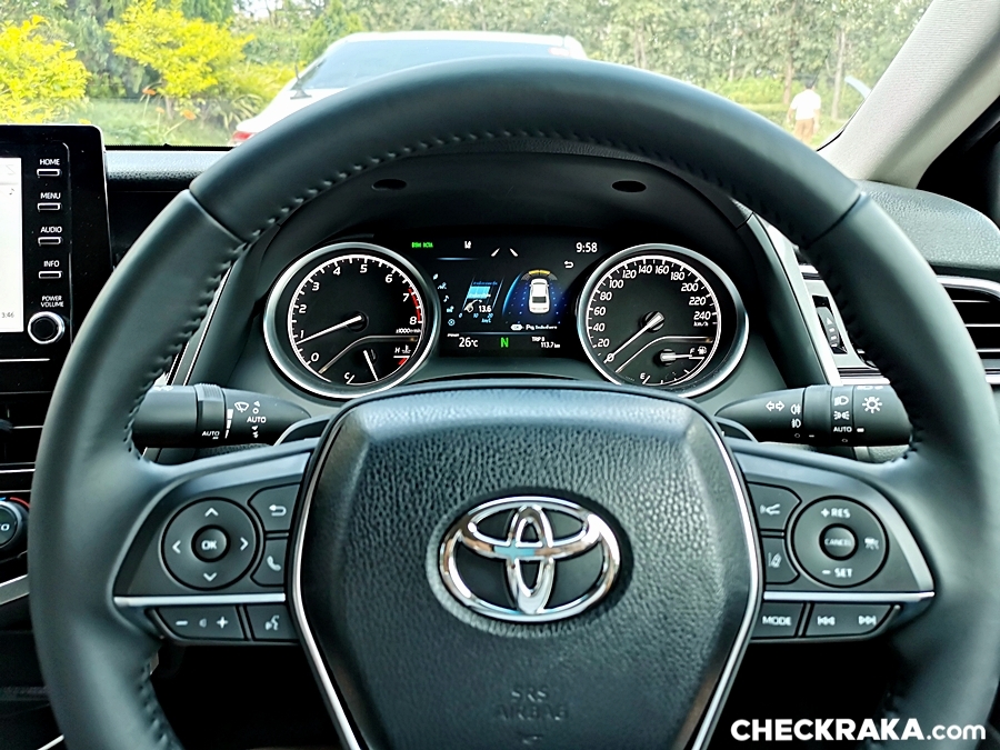 ช่วงสลับมาเป็นผู้ขับขี่สิ่งแรกเลยคือ วิสัยทัศน์ด้านหน้าที่ดี โปร่งสบายมองเห็นได้กว้าง กระจกมองข้างมองชัด พร้อมระบบเตือนมุมอับสาบตา พวงมาลัยกระชับมือออกไปทางสปอร์ต เบาะนั่งนุ่มสบาย ตำแหน่งการจัดวางของสวิตช์ควบคุมและหัวเกียร์อยู่ในรถดับกำลังดีไม่ต่ำหรือสูงเกินไป เบาะคนขับมีระบบบันทึกความจำ 2 ตำแหน่ง มาตรวัดแบบอนาล็อคทรงกลมซ้ายและขวาตรงกลางเป็นจอสีแสดงการทำงานของรถและมีลักษณ์เตือนของ Toyota Safety Sense