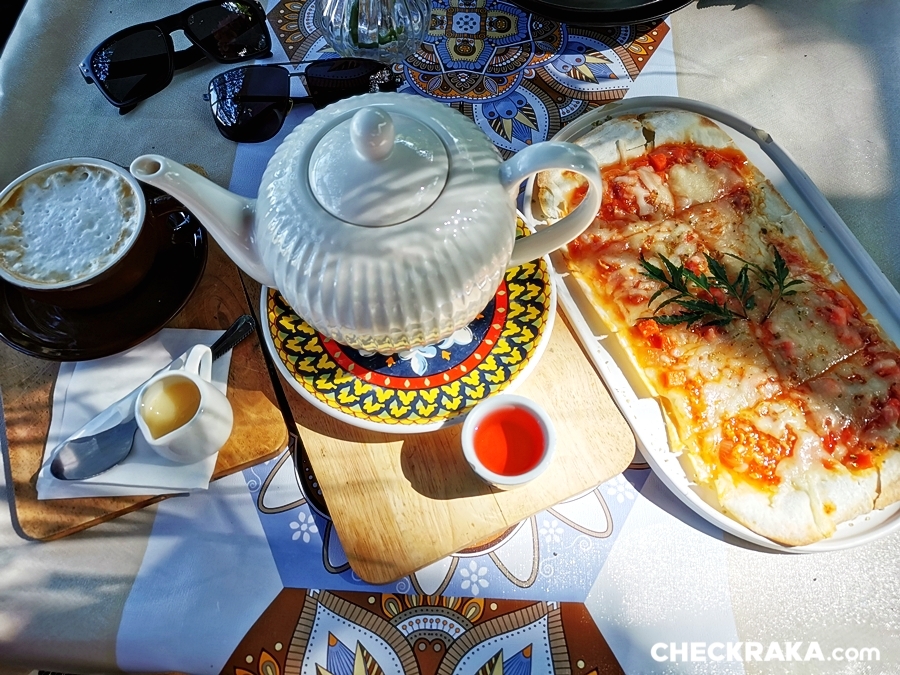 จากนั้นก็ขับไปอีกสักพักก็เจอร้านดังอีกแล้วนั่นคือ Nan Native Kew Muang by Chef First ที่ออกรายการ Mastor Chef Thailand (แต่ตัวไม่อยู่) สั่งพิซซ่า และกาแฟลาเต้ร้อน พร้อมกับชาร้อน ๆ แต่เมื่ออาหารมาถึงด้วยอากาศที่เย็นพอสมควร พิซซ่าและกาแฟจึงไม่ค่อยร้อนเท่าไหร่ แต่รสชาติอร่อยสมคำล่ำลือจริง ๆ ครับ