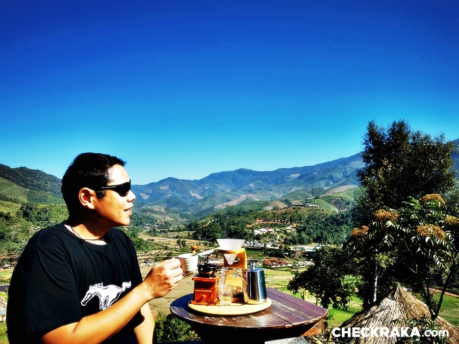 หยุดเวลา คาเฟ่.. ร้านกาแฟที่ต้องแวะเดี๋ยวจะไปไม่ถึงสะปันตั้งอยู่มุมสูงไหล่เขา มองเห็นเทือกเขาไกลลิบกับทุ่งนาและรีสอร์ท วันที่ไปถึงมีปริมาณคนหนาแน่นพอสมควร เมื่อสั่งกาแฟเสร็จก็เดินมาหามุมเก๋ ๆ ถ่ายรูปได้เลยครับ โดยจะมีมุมโต๊ะที่เซทเอาไว้โดยเฉพาะเพียงแค่ต่อคิวก็ได้วิวสวยแล้วครับ