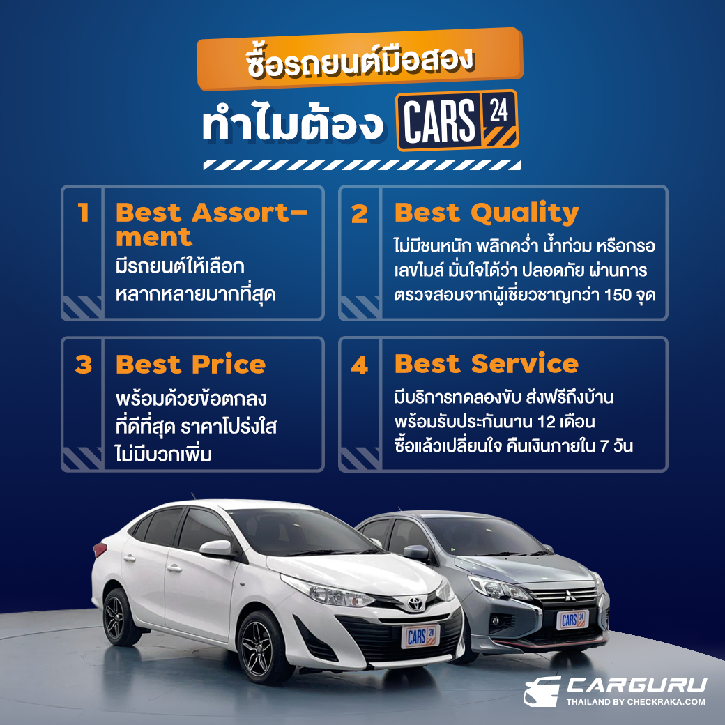 - Best Assortment : CARS24 คัดสรรรถยนต์กว่า 1,000 คัน มีรถให้เลืกหลากหลายที่สุด และค้นหาคันที่ใช่ในแบบที่คุณเลือก