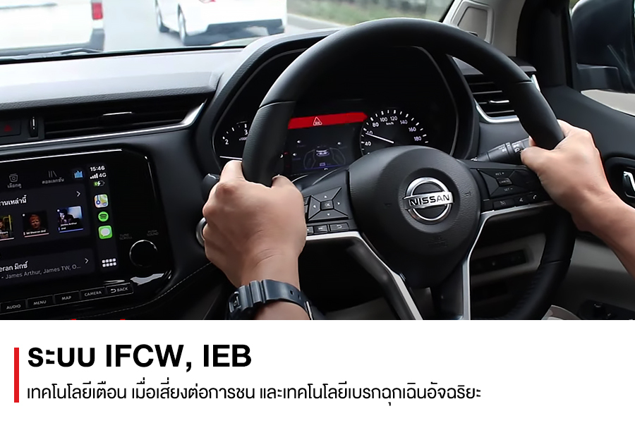 ถ้ามีเหตุการณ์ที่เสี่ยงต่อการชนด้านหน้าก็จะมีระบบเตือน พร้อมเบรกฉุกเฉินอัจฉริยะ (IFCW,IEB) แบบนี้