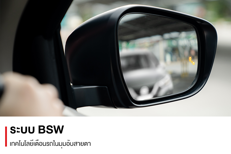 นอกจากนี้ถ้าเราจะเปลี่ยนเลน แต่กระจกมองข้างอาจสะท้อนรถที่ขับอยู่เลนอื่นไม่ได้ทั้งหมด เพราะมีจุดที่เรามองไม่เห็นเสมอ ระบบเตือนมุมอับสายตา (BSW) ทันทีที่สัญญาณไฟเลี้ยวถูกเปิดระบบจะส่งเสียงสัญญาณพร้อมไฟกระพริบเตือนให้รู้ล่วงหน้าเมื่อมีรถมาด้านข้าง