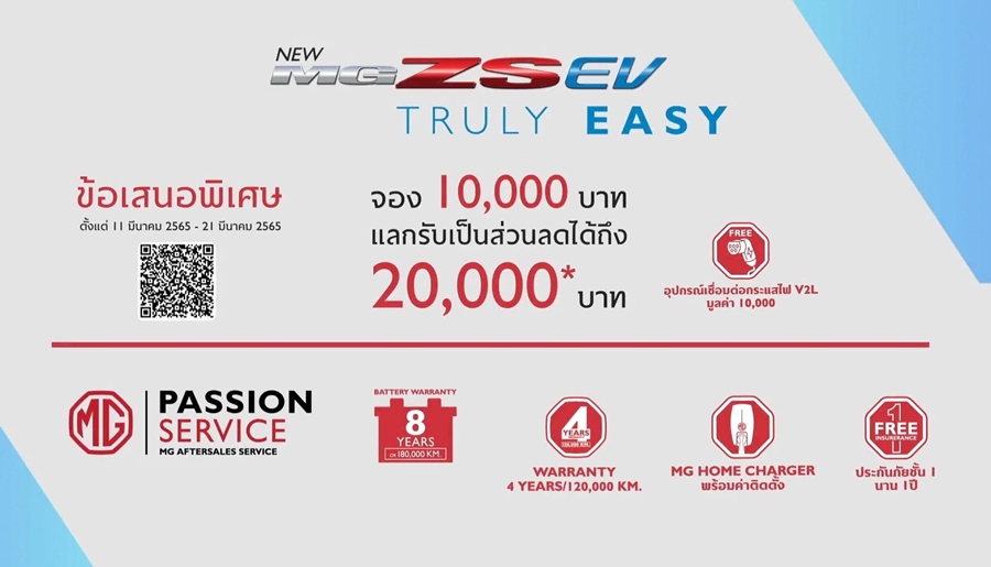 - เงินจอง 10,000 บาท จะมีมูลค่าเป็น 20,000 บาท เพื่อใช้หักออกจากราคาจำหน่าย NEW MG ZS EV เมื่อมีการส่งมอบรถอย่างเป็นทางการ