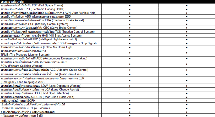 นอกจากนี้ยังเสริมอุปกรณ์ความปลอดภัย อาทิ จุดยึดเบาะนั่งเด็กแบบ ISOFIX ระบบล็อกประตูอัตโนมัติ (Speed Sensing Door Lock) เข็มขัดนิรภัยคู่หน้าแบบดึงรั้งกลับ ถุงลมนิรภัยคู่หน้า ด้านข้าง และม่านถุงลมนิรภัย กล้องมองภาพรอบทิศทางแบบ 3 มิติ (3D Around View Monitor) พร้อมสัญญาณเตือนระยะถอยหลัง ระบบกุญแจนิรภัยแบบ Immobilizer ระบบตรวจสอบความผิดปกติของลมยาง และระบบไฟส่องนำทางหลังจากดับเครื่อง