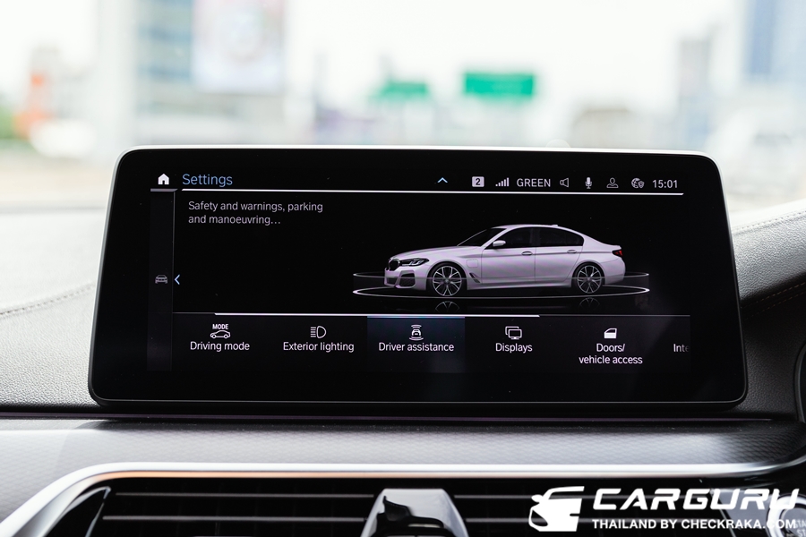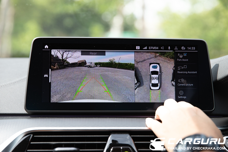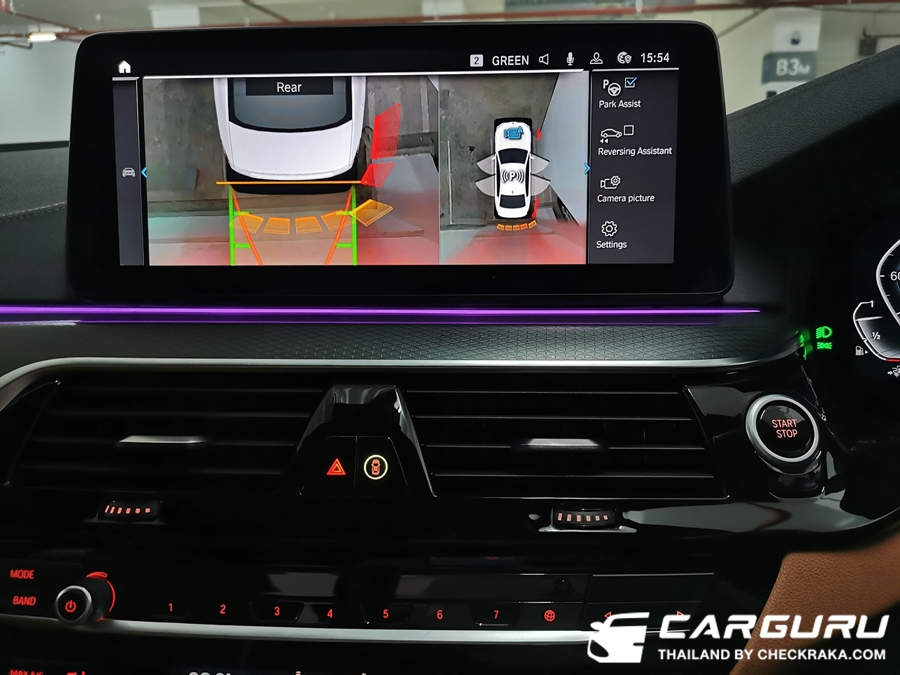 ถัดมาก็เป็นระบบเซ็นเซอร์ช่วยจอด นอกจากจะมีกล้องมองรอบคันแบบ 3 มิติแล้ว เซ็นเซอร์ยังเตือนเก่ง และจะเบรกฉุกเฉินให้เมื่อเห็นว่าส่วนของรถมีความเสี่ยงต่อการชน รถจะเบรกทันทีและแม้ว่าผู้ขับจะมองแล้วว่ายังไปต่อได้อีก แต่ 530e ก็จะไม่ยอมปล่อยเบรก แม้จะเติมคันเร่งแล้วก็ตาม แต่หากต้องการจะขยับรถต่อไปก็อาจจะต้องเร่งเครื่องฟืนสู่กับระบบเบรกนิดหน่อย เบรกจะค่อย ๆ คลายออกแล้วก็จะขยับรถได้ จากที่ได้ลองถอยเข้าบ้านซึ่งพื้นที่จะแคบ ๆ ระบบก็จะเบรกตลอดไม่ยอมให้ขยับรถเลย จนต้องเพิ่มคันเร่งสู้จึงจะถอยต่อไปได้ นับว่าช่วยลดความเสี่ยงต่อการชนได้ดีมากครับ