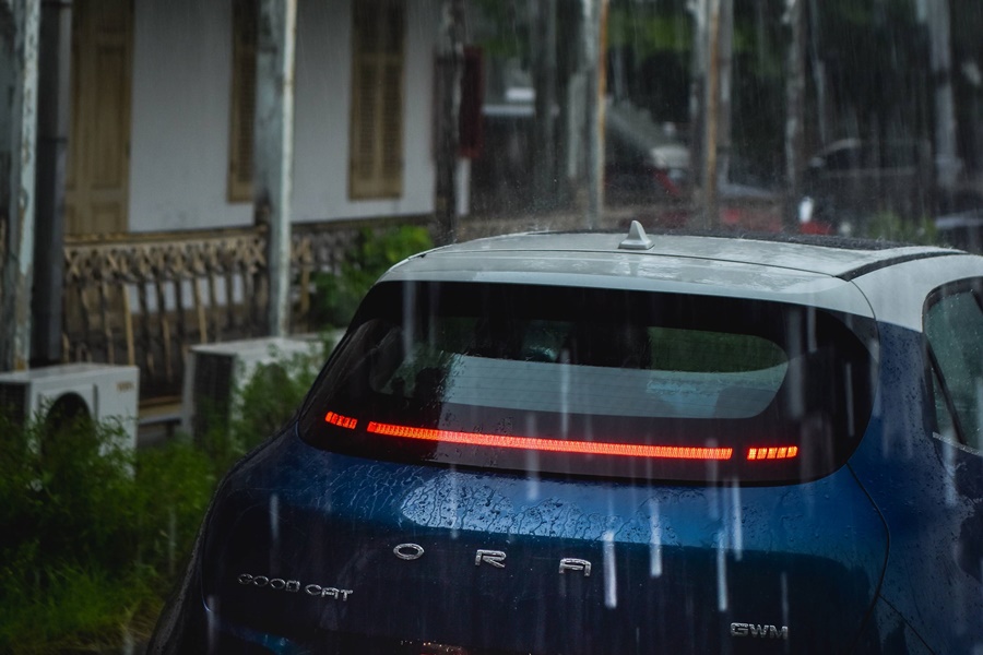 - สำหรับการขับรถในช่วงฝนตกก็ต้องระวังไม่ต่างจากการขับรถเครื่องยนต์สันดาปภายใน เช่น ควรขับรถโดยใช้ความเร็วให้เหมาะสมกับสภาพถนนเพื่อควบคุมรถบนถนนที่ลื่น และรักษาระยะห่างจากรถคันหน้ากว่าปกติ โดยรถยนต์ไฟฟ้า 100% ของ เกรท วอลล์ มอเตอร์ อย่าง ORA Good Cat ก็มีระบบช่วยเบรกฉุกเฉินบนทางตรงและทางแยกที่จะช่วยเพิ่มความปลอดภัยให้กับการขับขี่มากขึ้น นอกจากนั้น ยังมีกล่องหุ้มเซลล์แบตเตอรี่ที่แข็งแรง รองรับความปลอดภัยทางไฟฟ้า 5 ด้าน ได้แก่ การป้องกันน้ำ การกัดกร่อน การชน การกระแทก และการเกิดเพลิงไหม้ โดยหากเกิดการชนที่กระทบแบตเตอรี่ รถยนต์จะดับภายใน 50 มิลลิวินาทีเพื่อความปลอดภัย และยังมีการควบคุมอุณภูมิและการระบายความร้อนที่ดี ซึ่งช่วยป้องกันการเผาไหม้ที่อาจเกิดขึ้นเองของแบตเตอรี่ได้เช่นกัน