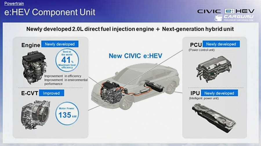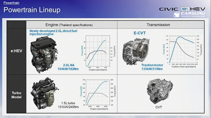 ฮอนด้า ซีวิค อี:เอชอีวี ใหม่ (Honda Civic e:HEV) รถยนต์ฟูลไฮบริด e:HEV ไลน์อับใหม่มาแทนที่รุ่น 1.5 เทอร์โบ RS กับ 2 รุ่นย่อยคือ EL+ และ RS ขุมพลังไฮบริดเต็มระบบผสานการทำงานอันทรงพลังร่วมกันของมอเตอร์ไฟฟ้า 2 ตัว กำลังมอเตอร์สูงสุด 184 แรงม้า ที่ 5,000 - 6,000 รอบต่อนาที ตอบสนองได้ทันใจด้วยแรงบิดมอเตอร์สูงสุด 315 นิวตัน-เมตร ที่ 0 - 2,000 รอบต่อนาที และเครื่องยนต์ใหม่คนละบล็อคกับแอคคอร์ด ขนาด 2.0 ลิตร Direct Injection Atkinson-Cycle DOHC กำลังสูงสุด 141 แรงม้า ที่ 6,000 รอบต่อนาที แรงบิด 182 นัวตันเมตร ที่ 4,500 รอบต่อนาที ให้อัตราประหยัดสูงสุดถึง 25 กิโลเมตต่อลิตร (ดอกจันทร์ - ในที่ทดสอบแบบปิดของฮอนด้า) ข้อมูลจากฮอนด้าแบบไปไม่เป็นทางการกำลังรวมสูงสุดทั้งระบบประมาณ 200 แรงม้า เนื่องจากกำลังสูดสุงอาจมาในรอบที่ไม่เท่ากัน รองรับน้ำมัน E20