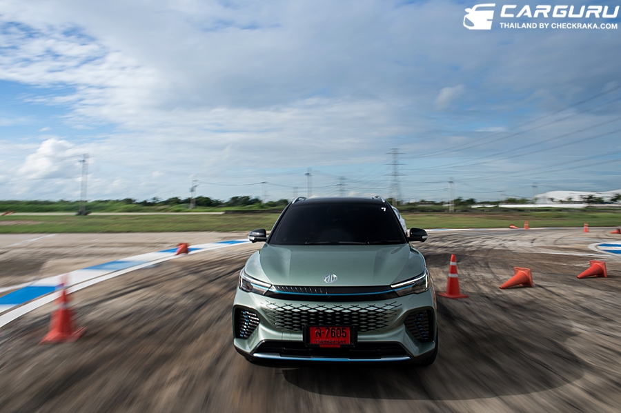 เมื่อนั่งยาว ๆ จนถึงสนามปทุมธานีสปีดเวย์ ก็เริ่มทดสอบในสถานีต่าง ๆ ที่ทางเอ็มจีเตรียมไว้ได้แก่ การขับเข้าโค้งในแทรกที่ความเร็วระดับ 40 - 60 กม./ชม. ซึ่ง MG VS HEV ให้ความมั่นใจในช่วงล่างได้ระดับหนึ่ง แต่ถ้าใช้ความเร็วเกินกว่านี้ขึ้นไปก็จะเริ่มออกอาการโยน เหวี่ยงและไถลเล็กน้อย แต่ต้องอย่าลืมว่าเป็นรถ SUV ที่มีความสูง การเข้าทางโค้งจึงต้องใช้ความเร็วอย่างเหมาะสมด้วยครับ