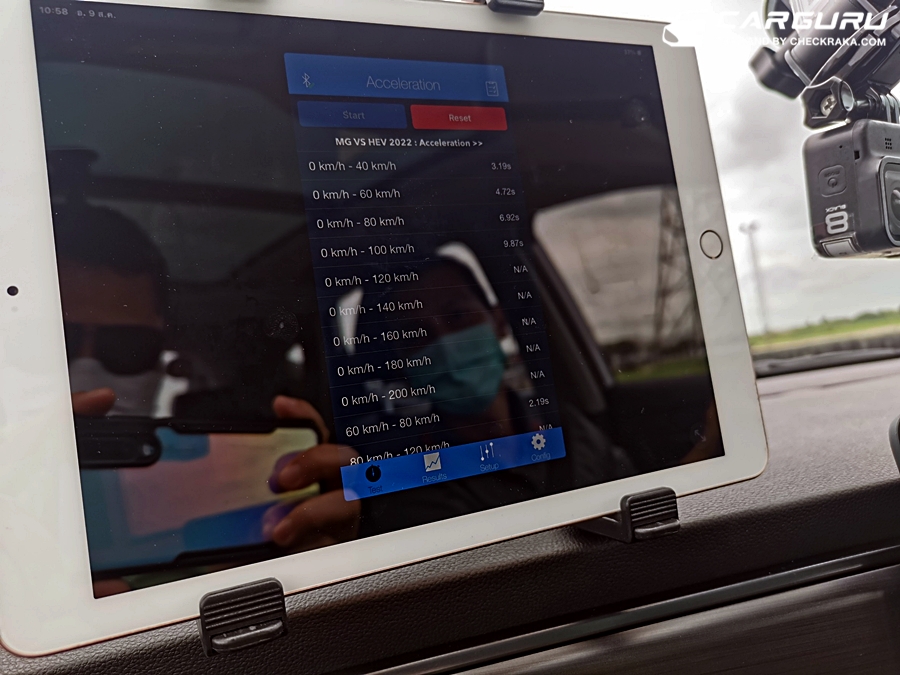 มาถึงการทดสอบทีมีสื่อหลายท่านสนใจและอยากทราบว่าเครื่องยนต์ไฮบริดที่ว่าไม่เน้นประหยัด แต่ขับสนุกจริงหรือไม่ โดยเอ็มจีได้จัดสถานีวัดอัตราเร่ง 0 - 100 กม./ชม. พร้อมเครื่องมือจับเวลาให้รู้กันไปเลยไม่ต้องคิดเอาเอง ซึ่งจากที่ทีมงานเช็คราคาได้ลองทดสอบทั้งหมด 2 ครั้งแบบไม่เร่งออกตัว แค่ปล่อยเบรกแล้วกดคันเร่งมิด ผลปรากฏว่าทำเวลาได้ดีที่สุดคือ.....9.87 วินาที ผ่าม! ส่วนสื่ออีกหลาย ๆ คนได้ลองส่วนมากเวลาจะอยู่ราว ๆ 8 ปลาย ๆ จึง 9 วินาทีกว่า ๆ อาจพอสรุปได้ว่า ถ้าออกตัวดีมีชัยไปกว่าหลายเสี่ยววินาที....ครับ!