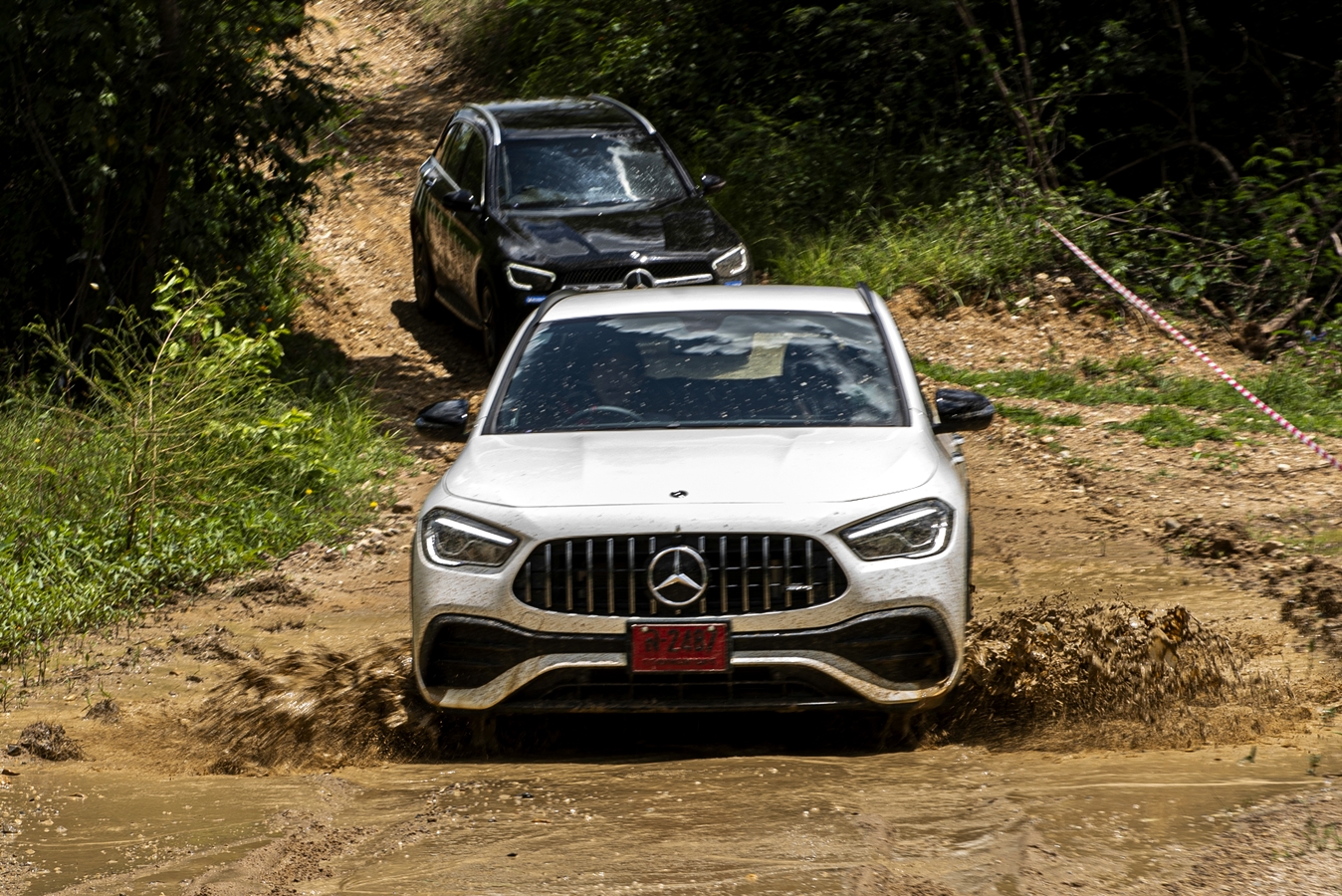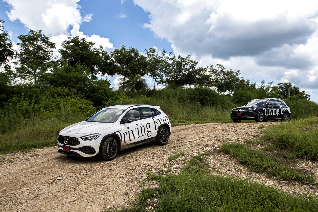 ผู้เขียนพร้อมทีมงานบันทึกภาพเดินทางร่วมกิจกรรมด้วยรถเมอร์เซเดส-เบนซ์ sprinter 419 ที่ให้ความสบายและปลอดโปร่งตลอดการนั่งทางไกล จุดหมายปลายทางอยู่ที่ GRAND PRIX MOTOR PARK จังหวัดกาญจนบุรี โดยการทดสอบขับแบ่งออกเป็น Training Session ซึ่งแบ่งออกเป็น 2 กลุ่มเพื่อสลับเปลี่ยนระหว่างสเตชั่นกับเดิร์ทแทร็ค เพื่อเกลี่ยนจำนวนผู้ทดสอบ (สื่อมวลชน) ให้พอดีกับจำนวนรถ ในส่วนของผู้เขียนได้อยู่ในกลุ่มไปขับเดิร์ทแทร็คก่อน โดยมีรถเมอร์เซเดสเอสยูวีหลากหลายรุ่นให้เลือกขับได้ตามชอบ ผู้เขียนเลือกขับรุ่น GLA35 4matic น้องเล็กแต่ไม่ธรรมดา พร้อมปรับโหมด slippery ตัวรถที่ปกติใช้งานแนวครอสโอเวอร์บนถนนดำอย่างที่หลายคนคุ้นตา งานนี้่นำมาขับลุยบนเส้นทางฝุ่นที่มีโคลนและน้ำขังสลับ ที่สำคัญคือ รถไม่ได้รับการปรับแต่งเพิ่มเติมใดๆ ทั้งสิ้นเป็นคันจริงแบบที่ขายทั่วไป การขับบนทาง Twin Track Speed ของ GRAND PRIX MOTOR PARK ใช้ระยะทางทั้งหมด 2 รอบ คิดเป็นระยะทางรวมราว 6 กม. ผู้เขียนขับตามรถนำขับโดย Instructor เพื่อดูไลน์และจุดระวัง การทำความเร็วเต็มที่บนทางดินแน่นโล่งไม่เกิน 40 กม./ชม. หลายช่วงเป็นการขับแบบ walking speed จุ่มโคลนบ้าง ลุยบ่อน้ำด้วย ไต่ขึ้นลงทางชันเนินไม่สูงมาก ผลตอบรับจาก GLA35 4matic เป็นรถที่เหมาะกับทางซิ้งเกิ้ลแทร็คแบบนี้จริงๆ ด้วยฐานล้อที่สั้น ทำให้การบังคับคล่องตัว แรงบิดที่ยอดเยี่ยมผสานกับระบบ 4matic ทำให้ตัวรถผ่านทุกสภาพพื้นผิวได้อย่างสบายๆ ไม่มีอาการสลิปใดๆ ให้รู้สึก รอบหลังได้ขับ GLS พี่ใหญ่สุดบนเส้นทางเดิมความรู้สึกต่างไปที่ตัวรถให้ความรู้สึกนั่งสบายขึ้นด้วยขนาดตัวถัง ขับง่ายขึ้นด้วยมุมมอง และสบายใจกับการขับผ่านอุปสรรคด้วยเทคโนโลยีอันทันสมัย เก็บอาการบนเส้นทางต่างๆ ได้ดีเยี่ยม จบในส่วนของการขับบนเส้นทางเดิร์ทแทร็ค สะท้อนให้เห็นว่ารถยนต์เมอร์ซิเดส-เบนซ์ เอสยูวีนอกจากขับบนถนนและข้ามอุปสรรคทั่วไปได้ดีมากอยู่แล้ว พอถึงคราวที่ต้องลุยบนทางออฟโร้ดและผ่านอุปสรรคธรรมชาติที่อยู่บนเส้นทางสัญจรจริงๆ ก็สามารถเอาตัวรอดออกมาได้แบบไม่ต้องสงสัย