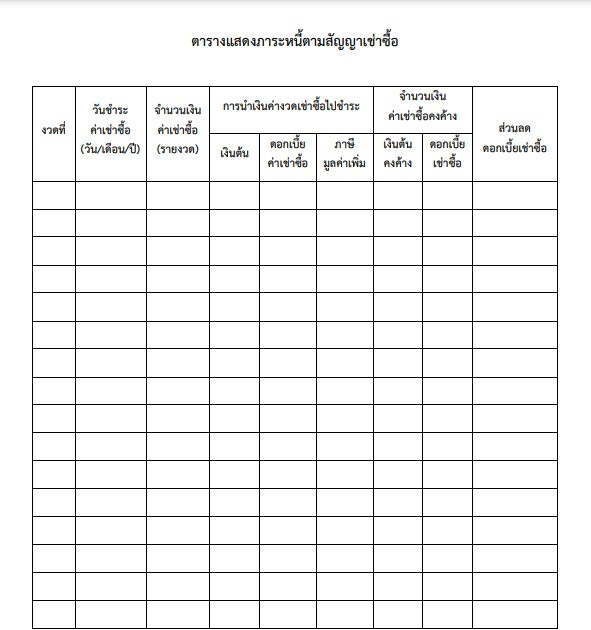 ผู้ให้เช่าซื้อ (ไฟแนนซ์) จะต้องมีตารางแสดงภาระหนี้ตามสัญญาเช่าซื้อสำหรับผู้เช่าซื้อแต่ละราย โดยให้แสดงรายละเอียดเกี่ยวกับจำนวนงวดค่าเช่าซื้อที่ต้องชำระ วัน เดือน ปี ที่ชำระเงินค่างวดเช่าซื้อ จำนวนเงินค่าเช่าซื้อที่ชำระในแต่ละงวด โดยแยกเป็นเงินต้น ดอกเบี้ยค่าเช่าซื้อ ภาษีมูลค่าเพิ่มและจำนวนเงินค่าเช่าซื้อคงค้าง โดยแยกเป็นเงินต้นคงค้าง ดอกเบี้ยค่าเช่าซื้อ รวมทั้งจำนวนส่วนลดที่ผู้เช่าซื้อจะได้รับตาม (๙) ตามเอกสารแนบท้ายประกาศนี้ เพื่อส่งมอบให้ผู้เช่าซื้อพร้อมกับหนังสือสัญญาเช่าซื้อ