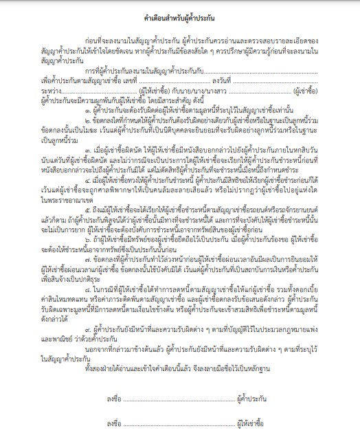 ตัวอักษรในหนึ่งนิ้ว และกำหนดข้อสัญญาเกี่ยวกับความรับผิดของผู้ค้ำประกันในสัญญาค้ำประกัน ซึ่งมีสาระสำคัญตรงกับคำเตือนดังกล่าว