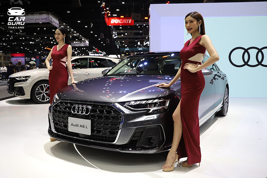 ทีเด็ดของบูธ AUDI คือคันนี้เลย "AUDI A8 L 55 TFSI quattro 2022" รถยนต์ซีดานพรีเมียมสุดหรู เพิ่งเปิดตัวสดๆ ร้อนๆ มาพร้อมเทคโนโลยีที่อัดแน่นเต็มคัน AUDI A8 L 55 TFSI quattro รุ่นล่าสุดนำเข้าทั้งคันแบบ CBU มาพร้อมขุมพลังเครื่องยนต์เบนซิน V6 3.0 ลิตร Turbocharged พร้อมระบบ Mild-Hybrid 48V ให้กำลังสูงสุดถึง 340 แรงม้า แรงบิดสูงสุด 500 นิวตันเมตร จับคู่กับเกียร์อัตโนมัติ 8 จังหวะ Tiptronic ขับเคลื่อน 4 ล้อ quattro