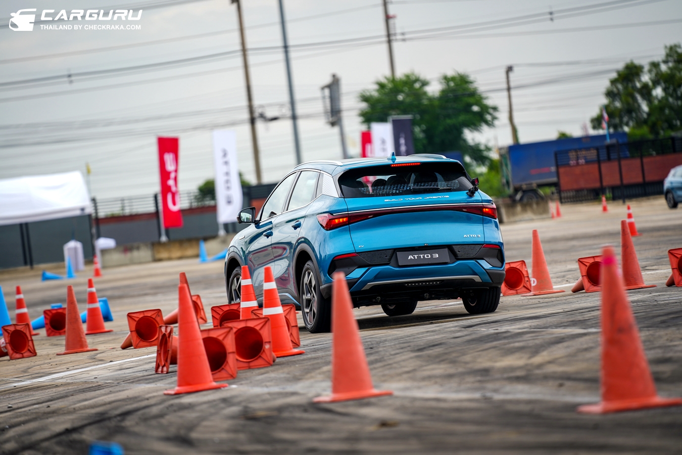 ได้ขับทดสอบในสนามปิด (ปทุมธานี สปีดเวย์) เมื่อช่วงปลายเดือนตุลาคมที่ผ่านมาก่อนเปิดตัว การทดสอบเริ่มจาก การออกตัวจากจุดหยุดนิ่งและเบรกเต็มแรง โดยปรับโหมดให้แตกต่างที่พวงมาลัยและเบรก ผู้เขียนลองเร่งจากจุดหยุดนิ่งและเบรกแบบเต็มที่ พบว่าตัวรถออกตัวได้ดีตามสไตล์อีวีที่มาทันที ยางมีอาการสลิปกับผิวแทร็คบ้างในช่วงออกตัวเต็มแรง การเบรกตอบสนองได้ดี ระยะหยุดหวังผลได้ตามคาด ผู้เขียนขับอยู่ 2 รัน อาจน้อยไปแต่ก็โอเคกับความรู้สึกขับครั้งแรก ต่อด้วยการขับเข้ากรวยเพื่อดูอาการตอนเปลี่ยนเลน ด้วยความเร็วระดับ 60 กม./ชม ตัวรถตอบสนองตามพวงมาลัยได้ดีทีเดียว เก็บอาการโอเวอร์สเตียร์ได้ดี และได้วิ่งเข้าโค้งความเร็วแถมบ้างก็รู้สึกโอเคกับการยึดเกาะและการตอบสนองของตัวรถไม่มีอาการโยน ส่วนการควบคุมตัวรถได้ขับเข้าวนกรวยเป็นเลข 8 จับอาการยึดเกาะด้านหน้าและโอเวอร์สเตียร์ของตัวรถ วนอยู่ 4 รอบ ต่อด้วยการขับเปลี่ยนเลนอีกครั้งแต่มุมและความเร็วมากกว่าเดิม ก็พอสรุปได้เบื้องต้นว่า ATTO 3 ทำได้ดีกว่าที่คาด แม้เป็นเอสยูวีที่มีค่า CG สูงกว่าซีดาน แต่การวางตำแหน่งแบตเตอรี่แผ่นบางใหญ่ไว้ด้านใต้ท้องรถน่าจะช่วยกระจายน้ำหนักให้รถมีสมดุลที่ดีด้วยส่วนหนึ่ง นับเป็นอีวีใหม่ในปีนี้ที่ขับแล้วชอบสุดโดยเฉพาะด้านสมรรถนะตัวรถอันเป็นหัวใจของการขับ