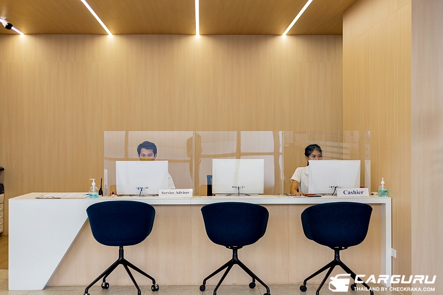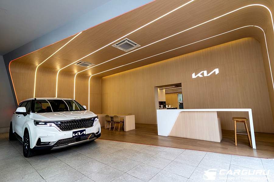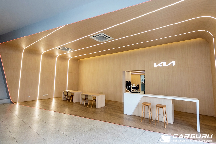 Exhibition Area แยกชัดเจนกับ Customer Area โดยในโซนจัดแสดงรถยนต์จะเน้นพื้นที่เปิดกว้างโปร่งสบาย และตกแต่งด้วยโลหะ ถูกแบ่งด้วยระบบไฟส่องสว่างรูปวงรีสีแดงที่ตัดผ่านระหว่างสองโซนที่เชื่อมเข้าด้วยกัน และยังให้ความสำคัญกับเฟอร์นิเจอร์ภายใน ด้วยการใช้วัสดุเนื้อสัมผัสที่นุ่มนวล เพื่อให้ลูกค้ารู้สึกสบายใจตลอดทุกช่วงเวลาที่มาเยี่ยมชม ส่วนพื้นที่ให้บริการซ่อมบำรุงโล่งโปร่ง แสงสว่างเพียงพอและปลอดภัย มีพื้นที่ในการบริการสะดวกและส่งผลให้ช่างสามารถทำงานได้อย่างคล่องตัว พร้อมกับการจัดวางอุปกรณ์เครื่องมือต่าง ๆ ที่เรียบร้อยและใช้งานง่าย เพื่อให้งานบริการเป็นไปตามมาตรฐานเกีย ประเทศเกาหลีใต้ และพื้นที่ส่งมอบรถยนต์ที่กว้างขวางเพื่อให้ลูกค้าได้เดินชมรถรอบคันได้สะดวกขึ้น