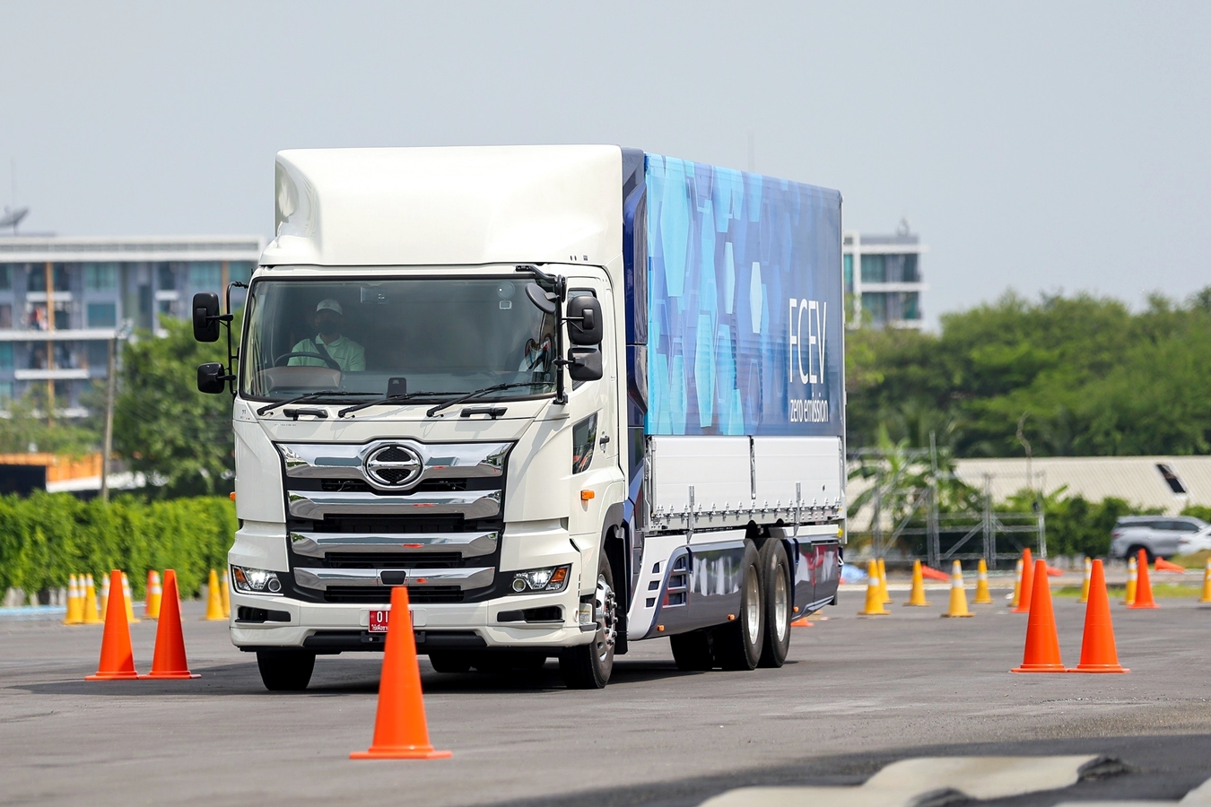 รุ่นสุดท้ายที่ได้ลอง เป็นรถบรรทุกเล็กขนาด 6 ล้อ Hino เทียบกับไฟฟ้าเซลล์เชื้อเพลิง หรือ FCEV กับ เครื่องยนต์ทั่วไป ICE ค่อนข้างชัดเจนมาก ทั้งการออกตัว อัตราเร่ง และอาการสั่นสะท้าน ที่น่าประทับใจคือ พลังจากมอเตอร์ไฟฟ้าที่ให้กำลังฉุดตัวรถจนไม่คิดว่ากำลังขับรถบรรทุก 6 ล้ออยู่ ตัวรถออกตัวได้ฉับไวและพอลอยตัวไปแล้วก็ให้อัตราเร่งที่ดีมาก นับว่าสนใจว่าจะสามารถนำมาใช้เริ่มกับโครงการนำร่องได้เร็วแค่ไหน ซึ่งคงขึ้นอยู่กับว่าประเทศไทยจะสามารถผลิตเชื้อเพลิงจากมูลสัตว์เปลี่ยนสภาพเป็นไฮโดรเจนในถังได้เองเมื่อไหร่ เพราะตอนนี้ยังต้องส่งมูลสัตว์อย่างขี้ไก่จากฟาร์มส่งไปทรานฟอร์มเป็นพลังงานที่ญี่ปุ่นก่อนเพื่อการทดลอง