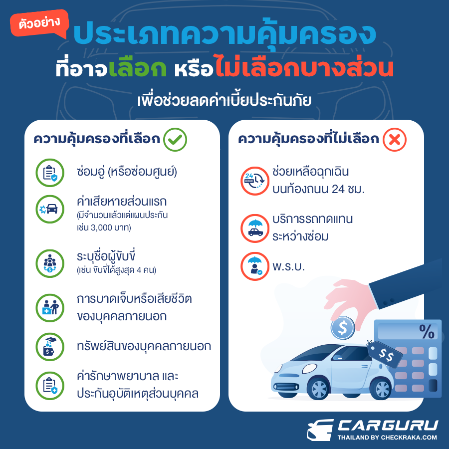 2. เลือกประเภทประกันภัยรถที่เหมาะสม : การเลือกประเภทของประกันรถที่เหมาะสม อาจช่วยลดค่าเบี้ยประกันรถได้ โดยการเลือกประเภทประกันภัยรถยนต์ต้องคำนึงถึงรูปแบบของประกันรถที่เราต้องการ เช่น ประกันรถชั้น 1, ประกันรถชั้น 2+, หรือประกันรถชั้น 3 และให้ความสำคัญกับขอบเขตความคุ้มครองโดยอาจเพียงความคุ้มครองที่จำเป็นอาจช่วยลดค่าเบี้ยประกันรถลงได้ เช่น ในการซื้อประกันภัยรถยนต์ 1 ฉบับ เราอาจเลือกความคุ้มครอง และไม่เลือกความคุ้มครองบางส่วน ซึ่งอาจทำให้ค่าเบี้ยประกันภัยลดลงได้ ดังนี้