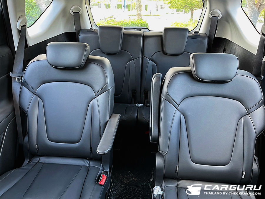 และเมื่อเปิดประตูผู้โดยสารตอนหลังที่สามารถเปิดได้กว้างทำให้เข้าออกสบาย ตัวเบาะแถว 2 นุ่มนวลและนั่งสบายเช่นกัน พร้อมพับปรับเพิ่มพื้นที่ได้แบบแบบราบ และนอกจากนี้เบาะแถวที่ 3 ตัวเบาะมีขนาดเล็กสั้นทั้งเบาะนั่งและพนักพิงหลัง และหัวหนอนดันหลังเต็ม ๆ ต้องยืดหมอนรองศีรษะขึ้นมาให้พอดีจึงนั่งได้ และมีพื้นที่ไม่แตกต่างจากคู่แข่ง 7 ที่นั่งระดับเดียวกัน แต่ด้วยความนั่มนวลของตัวเบาะเองก็ทำให้นั่งได้สบายตัว และยังมีพื้นที่เหนือศีรษะมากพอสมควรอีกด้วยครับ
