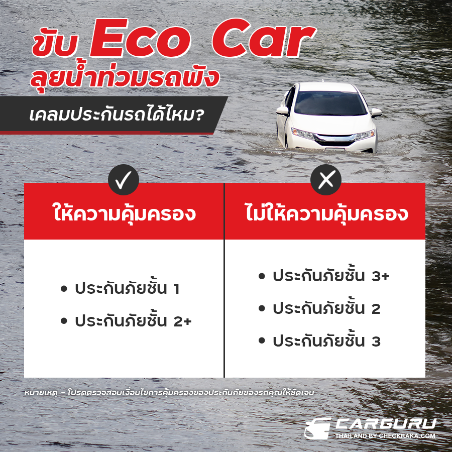การเคลมประกันรถภายหลังจากการขับรถยนต์อีโคคาร์ ผ่านเหตุการณ์น้ำท่วม, น้ำขัง จนทำให้รถยนต์ได้รับความเสียหายนั้นก็ขึ้นอยู่กับเงื่อนไขและข้อกำหนดที่ระบุในกรมธรรม์ประกันรถของคุณ โดยส่วนใหญ่จะให้ความคุ้มครองสำหรับรถที่ทำ ประกันภัยชั้น 1 และ ประกันภัยชั้น 2+ ซึ่งจะมีการระบุว่า บริษัทจะชดใช้ค่าสินไหมทดแทน เพื่อความเสียหายที่เกิดขึ้นระหว่างระยะเวลาประกันภัย อันมีสาเหตุมาจากภัยธรรมชาติต่างๆ ต่อรถยนต์ รวมทั้งอุปกรณ์เครื่องตกแต่ง หรือสิ่งที่ติดประจำอยู่กับตัวรถยนต์ ซึ่งในทีนี้ก็จะหมายรวมถึงกรณีน้ำท่วมนั่่นเอง ดังนั้นผู้ที่ทำประกันภัยดังกล่าว ก็สบายใจได้ว่าจะได้รับคุ้มครองแน่นอน แต่จำนวนเงินที่จะชดเชยหรือซ่อมแซมนั้นก็ขึ้นอยู่กับจำนวนทุนประกันที่เราได้ทำไว้ แต่อย่างไรก็ดี โปรดตรวจสอบเงื่อนไขการคุ้มครอง และความคุ้มครองที่คุณได้ซื้อประกันภัยของรถอีโคคาร์ของคุณ ซึ่งความคุ้มครองสามารถแตกต่างกันไประหว่างบริษัทประกันต่าง ๆ นอกจากนี้ยังมีปัจจัยอื่น ๆ เช่นความเสียหายที่เกิดขึ้น, เปอร์เซ็นต์ความเสียหายที่คุ้มครอง อีกด้วย