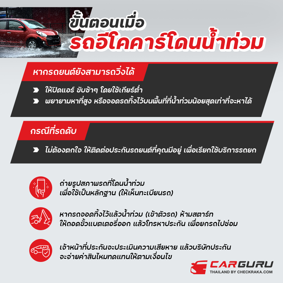 และเมื่อเกิดความเสียหายกับรถยนต์อีโคคาร์ของคุณเนื่องมาจากการน้ำท่วม สิ่งที่คุณควรจะต้องทำคือการแจ้งสถานที่กับบริษัทประกันภัยที่รถคุณมีสัญญาอยู่ทันทีเพื่อแจ้งเหตุให้บริษัทประกันนั้นๆ รับทราบเกี่ยวกับความเสียหายที่เกิดขึ้น โดยบริษัทประกันจะให้คำแนะนำต่างๆ ในขั้นตอนการเคลม และเอกสารที่จำเป็นที่คุณจะต้องใช้ เช่น แบบฟอร์มเคลม, หลักฐานของความเสียหาย เป็นต้น อย่างไรก็ตามอาจมีข้อจำกัดหรือเงื่อนไขที่บังคับใช้ เช่น ความรับผิดตามข้อกำหนดของกรมธรรม์, ส่วนความรับผิดอื่น ๆ อาจขึ้นอยู่กับเหตุการณ์ที่เกิดขึ้น หากมีข้อสงสัยควรติดต่อตัวแทนจำหน่ายหรือติดต่อแผนกบริการลูกค้าของบริษัทประกันเพื่อขอคำปรึกษาและความช่วยเหลือเพิ่มเติม