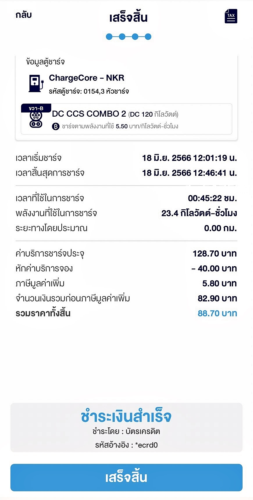 ระดับไฟฟ้าในแบตเตอรี่ 100% เมื่อขับไปถึงจุดหมายแรกระยะทาง 77 กม.เหลือ 79% และถึงที่พักระยะทางรวม 95 กม.แบตฯคงเหลือ 65% ส่วนวันเดินทางกลับจนมาถึงจุชาร์จไฟ PTT Station ปตท. LPG วังน้อยระยะทาง 26 กม. แบตฯ คงเหลือ 51% จองล่วงหน้าผ่านระบบใน EVstationPlus ใช้เวลาในการชาร์จ 45 นาที ระดับแบตฯ เพิ่มเป็น 95% ค่าไฟเพียง 88 บาท ซึ่งความจริงแล้วสามารถขับกลับถึงบ้านได้เลย แต่ชาร์จเผื่อเอาไว้ขับไปธุระที่อื่น ๆ