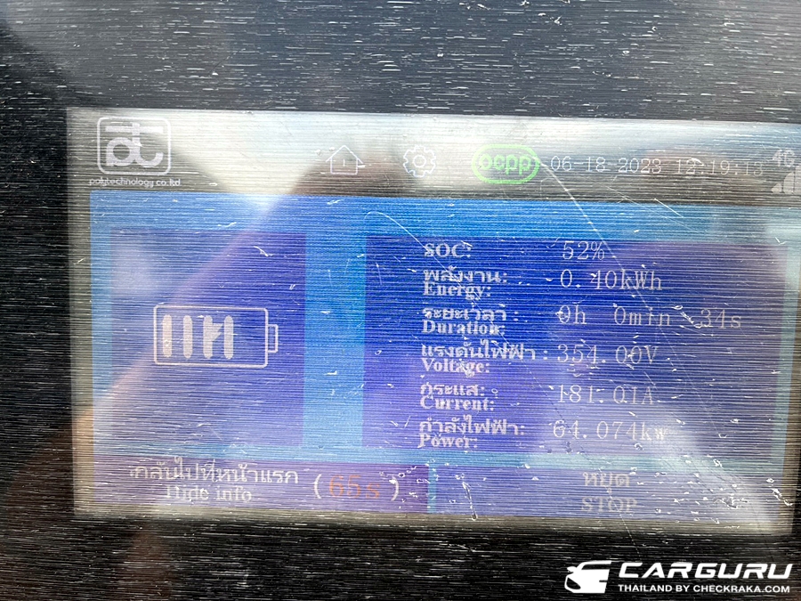 ระดับไฟฟ้าในแบตเตอรี่ 100% เมื่อขับไปถึงจุดหมายแรกระยะทาง 77 กม.เหลือ 79% และถึงที่พักระยะทางรวม 95 กม.แบตฯคงเหลือ 65% ส่วนวันเดินทางกลับจนมาถึงจุชาร์จไฟ PTT Station ปตท. LPG วังน้อยระยะทาง 26 กม. แบตฯ คงเหลือ 51% จองล่วงหน้าผ่านระบบใน EVstationPlus ใช้เวลาในการชาร์จ 45 นาที ระดับแบตฯ เพิ่มเป็น 95% ค่าไฟเพียง 88 บาท ซึ่งความจริงแล้วสามารถขับกลับถึงบ้านได้เลย แต่ชาร์จเผื่อเอาไว้ขับไปธุระที่อื่น ๆ