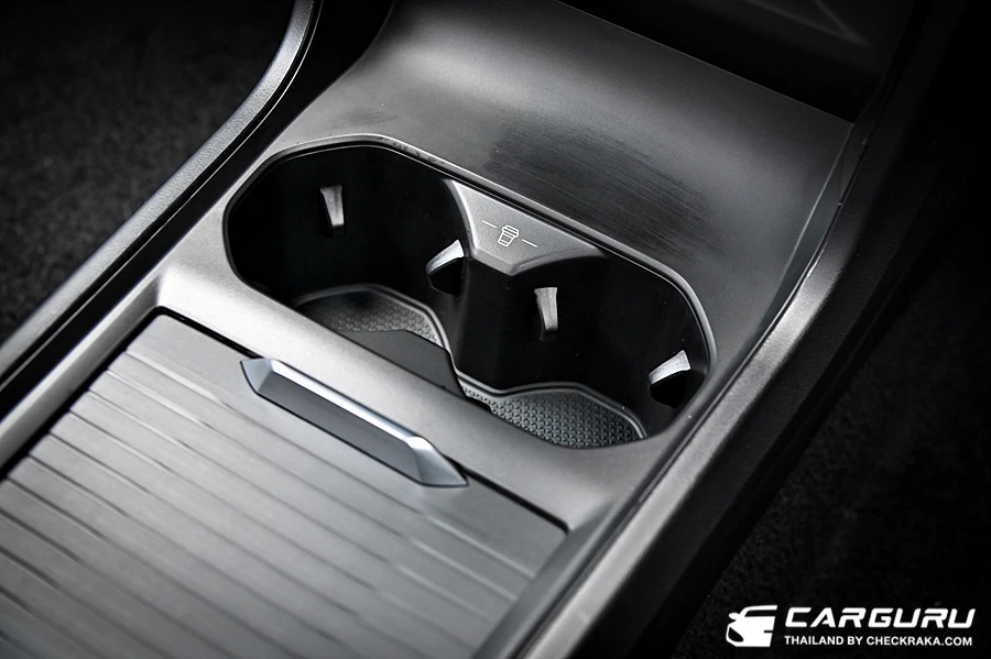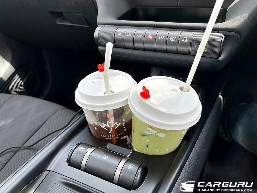 ที่วางแก้วน้ำของ MG4 วางแก้วได้หลายขนาด แต่ก็หยิบยากเพราะอยู่ใต้แผงสวิตช์เกียร์ ยังดีที่ตำแหน่งไม่ลึกมากนัก ส่วนด้านข้างแผงประตูเป็นเรียบ ๆ ขนาดเล็กวางได้เพียงขวดน้ำกับเอกสาร วางแก้วไม่ได้ นับเป็นจุดอ่อนที่น่าเสียดายยิ่งนัก (สำหรับผู้เขียนนะ)
