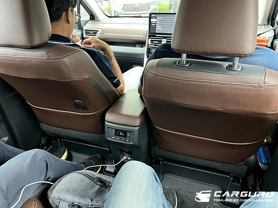 ในเบาะแถวที่สองมีสิ่งอำนวยความสะดวกเต็มที่ทั้ง ที่ว่างแก้วน้ำ วางแขน โต๊ะพับเก็บได้ แต่วัสดุดูไม่ค่อบแข็งแรงเท่าไหร่ ส่วนที่รองน่องเมื่อยกขึ้นมาต้องระวังปลายเท้าไปขัดกับเบาะหน้า ต้องคอยขยับหลบ แต่เบาะพิงสามารถปรับเอนได้เยอะมากจนเกือบจะนอนแบนราบทำให้นอนพักผ่อนได้สบาย ๆ เลยครับ