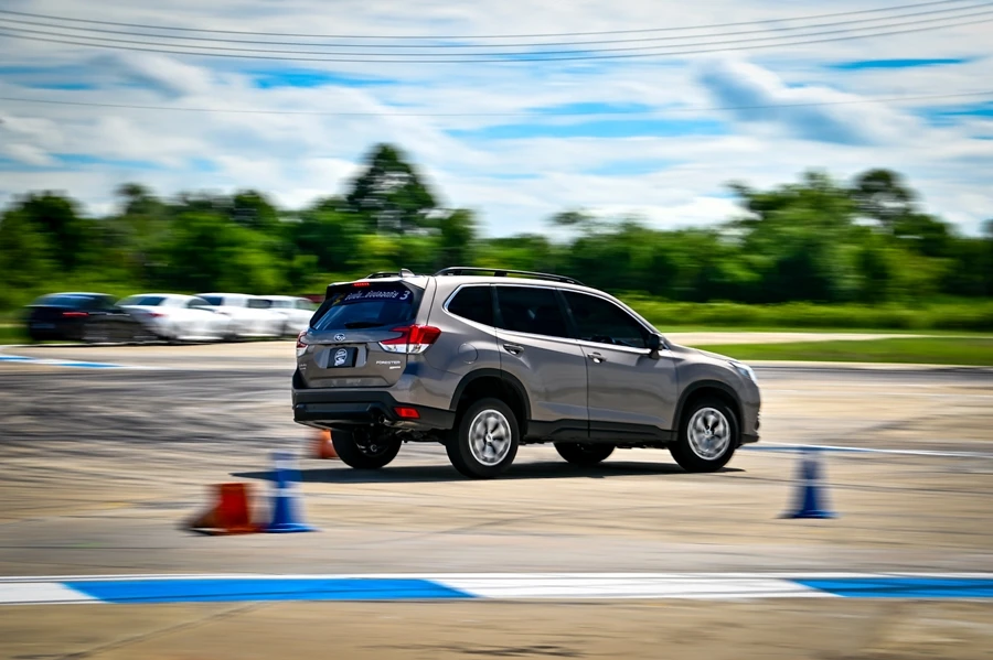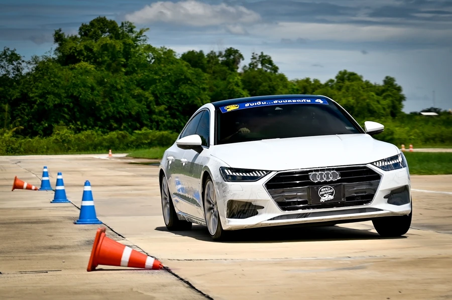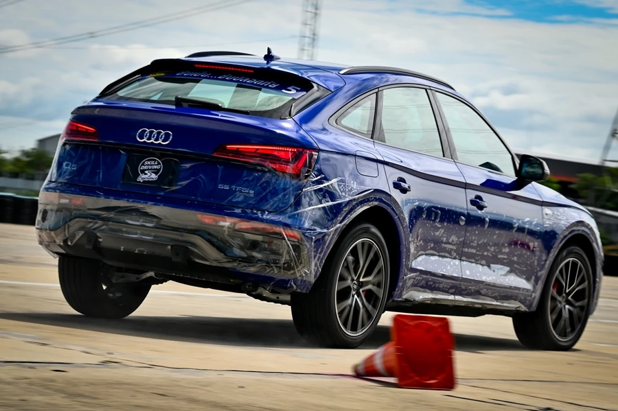 สถานีสุดท้ายในช่วงแรกเป็น Double lane change กับรถ Audi ที่ให้ต้องขับรถเข้ากรวยแล้วเปลี่ยนเลนกระทันหันซ้าย-ขวาพร้อมเบรกให้หยุดสนิทเมื่อรถกลับมาสู่ทางตรง การฝึกขับในแต่ละรอบจะเริ่มจากความเร็ว 70 กม./ชม. ขยับไป 80 และ 90 การล็อคความเร็วไม่ให้ต่ำกว่าที่กำหนดเป็นเรื่องละเอียด แต่ความสำคัญอยู่ที่การบังคับหักเปลี่ยนเลนให้อยู่ในช่องทางที่วางกรวยไว้ให้ได้ และเริ่มเบรกก็ต่อเมื่อรถกลับมาสู่ทางตรง นับเป็นการฝึกที่นำไปใช้ได้บ่อยในการขับรถทั่วไป