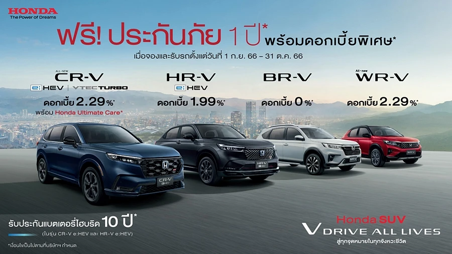 - ฮอนด้า เอชอาร์-วี อี:เอชอีวี รับข้อเสนอดอกเบี้ย 1.99% พร้อมฟรีประกันภัย 1 ปี รวมทั้งรับประกันแบตเตอรี่ไฮบริด 10 ปี และรับประกันระบบไฮบริดทั้งระบบ 5 ปีไม่จำกัดระยะทาง