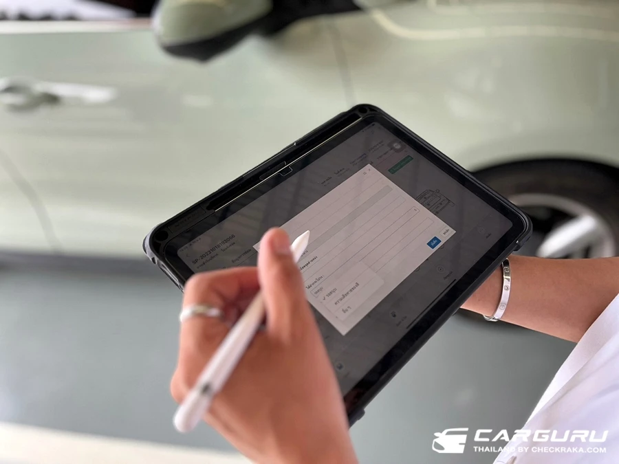 เจ้าหน้าที่มารับลูกค้าตรวจสอบความถูกต้องด้วย "IPAD" ที่จุดจอดรถรับบริการพร้อมตรวจสอบสภาพรถโดยรอบ