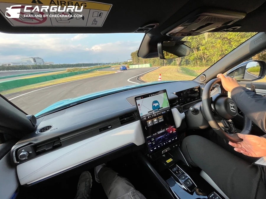 การขับทดสอบใน Honda R&D Japan Proving Ground ผู้เขียนนั่งไปกับเพื่อนสื่อมวลชนด้วยกันก่อน 3 รอบ จากนั้นจึงได้ขับเองอีก 3 รอบ ช่วงระหว่างนั่งในตำแหน่งผู้โดยสารแถวหน้าพบว่าตัวรถออกตัวได้อย่างนุ่มนวลให้อัตราเร่งที่สมูธคงความสบายไม่กระชากหรือหยุดจนเสียอาการ การบังคับเลี้ยวไปตามโค้งดูแม่นยำและตอบสนองได้ทันใจ แต่ช่วงเร่งมีเสียงมอเตอร์แผ่วเบาให้ได้ยินตามความเร็ว เมื่อสลับมานั่งขับเองกพบว่าตัวรถออกตัวได้น่าพึงพอใจมากกับการเป็น EV สมูธดี ตำแหน่งหน้าจอและเรือนไมล์มองได้ชัดเจนสวยงาม cockpit ที่เน้นให้ผู้ขับเป็นหลักก็มองอย่างเข้าใจง่ายใช้งานสะดวก ตำแหน่งการปรับฟังก์ชันต่างๆ ทำได้ง่าย รอบแรกใช้โหมด ECO การหน่วงตอนกดและยกคันเร่งก็รู้สึกได้ชัดเจนหน่อย ไล่เรียงการตอบสนองได้ไวขึ้นตามโหมด Neutral และ Sport ที่ชอบคือการบังคับเลี้ยวตัวถังไม่มีอาการโรลมากจนต้องระแวงแม้ใช้ความเร็วระดับค่อนข้างสูงเข้าโค้งกว้าง การขับไล่ฮอนด้า ซีวิค e:HEV ในสนามช่วงหนึ่งยังพอเกาะไลน์ตามไปได้อย่างไม่ลำบากนัก แม้ทำความเร็วเข้าใกล้ก็ตาม การลองทั้งหมด 3 รอบ อาจไม่ถึง 5 กม. แต่ก็พอเห็นทิศทางคาแรคเตอร์ของ ฮอนด้า e:N1 ว่าทำได้ดีใกล้เคียงรถเครื่องยนต์สันดาป การออกแบบภายนอกที่ดูเหมือน HR-V อาจเป็นจุดที่ดูไม่น่าดึงดูดมากนัก แต่ภายในกลับมีความแตกต่างที่ชัดเจนดูทันสมัยและพรีเมียมกว่า ส่วนเรื่องของเสียงจากมอเตอร์ไฟฟ้าตอนเร่งนั้น ชวนให้นึกถึงรถยนต์ทั่วไปที่ติดตั้งชุดเครื่องเสียงมาไม่ลงตัวแล้วมีเสียงวี๊ดเบาๆ ตามรอบการเร่ง ถ้าเปิดเพลงกลบก็คงมองข้ามไปได้ แต่ใครที่ไม่ชอบเสียวรบกวนเล็กน้อยในห้องโดยสารอาจรู้สึก อย่างไรก็ตามเมื่อมีการผลิตเพื่อจำหน่ายจริงในโซนอาเซียนก็ต้องรอทดสอบกันอีกครั้งว่าจะมีความแตกต่างจากที่ได้ลองครั้งนี้หรือไม่