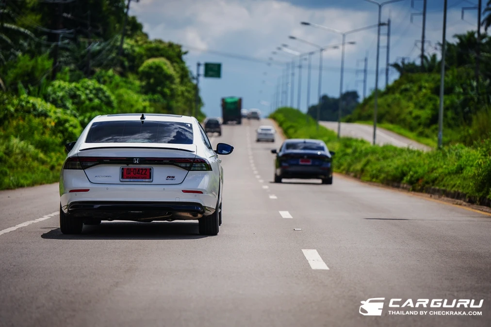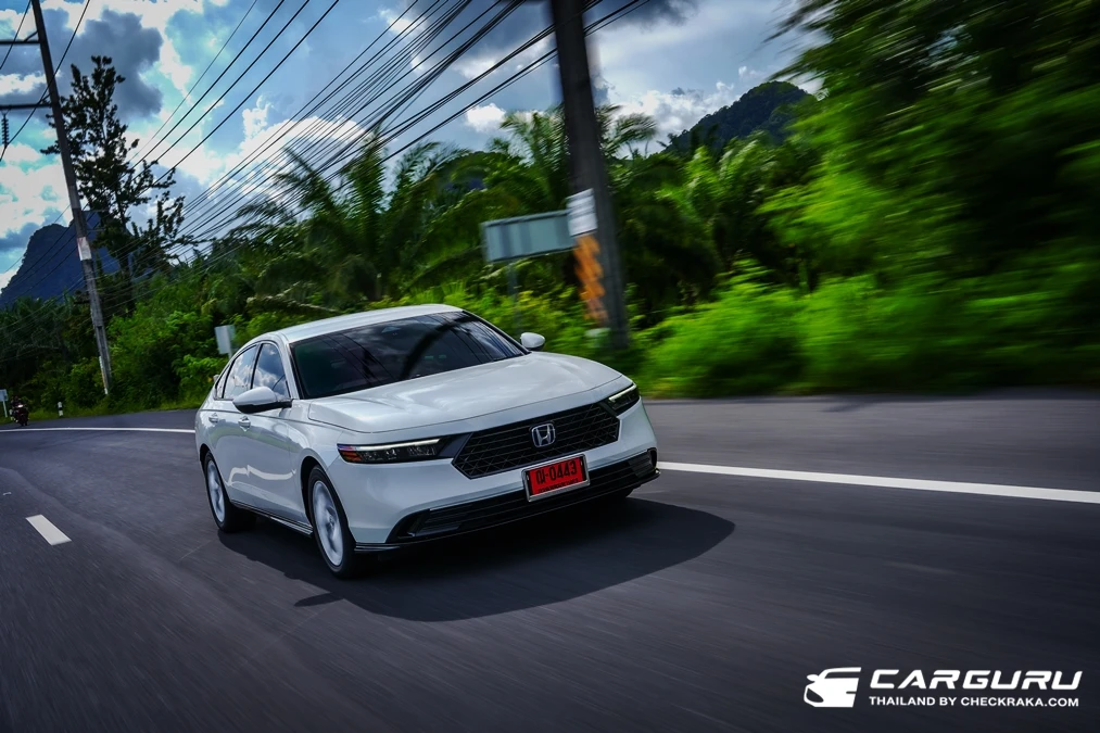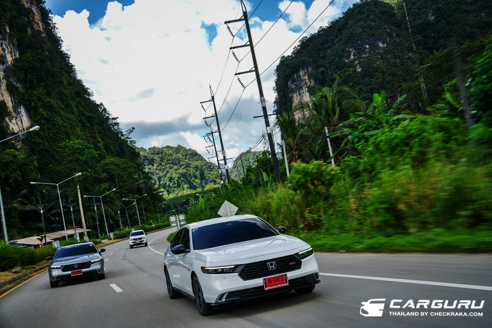 Honda Accord e:HEV ในครั้งนี้มีทั้งหมด 6 คัน คละรุ่น ซึ่งซุ่มได้รุ่นเริ่มต้น E ราคา 1.529 ล้านบาท ทดสอบแบบครึ่งวัน ไปกลับจากภูเก็ต-พังงา ระยะทางร่วม 270 กม. กลับกันขับขี่ 2 คน ต่อ รถ 1 คัน โดยได้ทดลองขับทั้ง ใช้ความเร็วตามสภาพจราจร เร่งแซง ทำความเร็วสูง ๆ และด้วยเส้นทางเป็นเนินเขาสลับทางโค้งมากมาย จึงได้ลองการเข้าทางโค้ง การเร่งแซงขึ้นเนิน การเบรก และทดลองระบบช่วนละลอดความเร็ว บนแพดเดิ้ลชิพ และการใช้โหมด Batt-Charge สุดท้ายลองฟังพลังเสียงจากลำโพง BOSE 12 ตำแหน่ง บอกเลยว่าเสียงใสนุ่มลึกเบสตรึม!