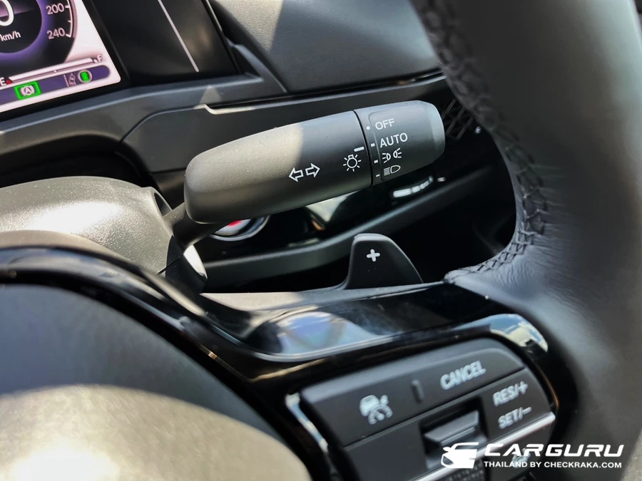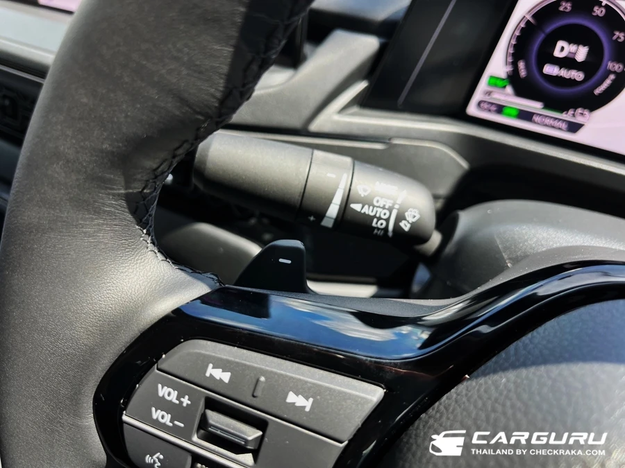 วิศวกรชาวญี่ปุ่นของฮอนด้า เน้นย้ำนำเสนอว่า เราเค้ามีโหมด หน่วงความเร็ว (Deceleration Paddle Selectors) ระดับ 5 และ 6 เพิ่มมาจากเดิมมีแค่ 4 ระดับ และทำงานคล้ายกับ one-Paddle ชับด้วยคันเร่งเดียว ทั้งเร่งทั้งชะลอและหยุดรถได้เกือบจะจอดสนิท เมื่อความเร็วต่ำกว่าราว ๆ 20 - 30 กม. ต้องเบรกเอาเองด้วย โดยฟังก์ชั่นนี้ใช้ตัวควบคุมระบบ ABS ช่วยสั่งให้ล้อเบรกแบบ "เลีย ๆ" พร้อมกับแรงหน่วงของมอเตอร์ไฟฟ้าไปพร้อมกัน (เพราะมอเตอร์ไฟฟ้ายังหน่วงไม่พอในระดับนี้) เรียกว่าได้แรงบันดาลใจจาก "Honda e" ตัวเล็กน่ารักนั่นเองครับ ซึ่งจะโชว์บนมาตรวัดขับครับข้าง ๆ สัญลักษณ์ตำแหน่งเกียร์ต่าง ๆ และยังสามรถล็อคในระบบหน่วงค้างเอาไว้ (เหมือนคันเร่งในรถยนต์ไฟฟ้าล้วนจริง) เพียงแค่ดึงฝั่งลบ (-) เข้าหาตัวค้างไว้ 1 วินาที ก็กลายเป็นรถไฟฟ้าล้วน (ชั่วคราว) ที่ขับด้วยคันเร่งเดียวด้วย และเมื่อยกเลิกให้ดึงฝั่งบวก (+) เข้าหาตัวค้าวไว้ 1 วินาทีก็ปลดออกเรียบร้อยครับ