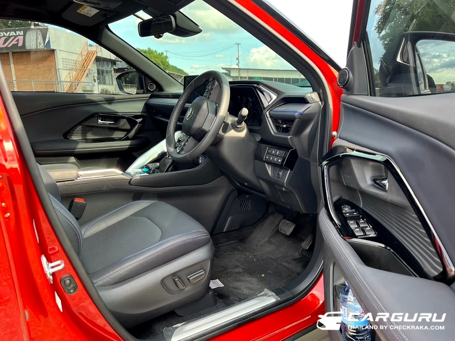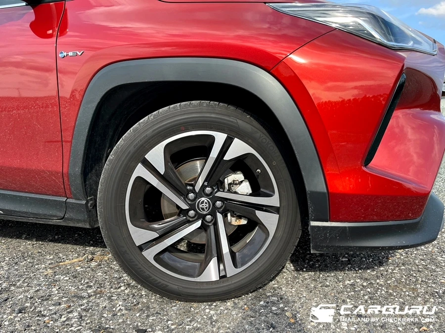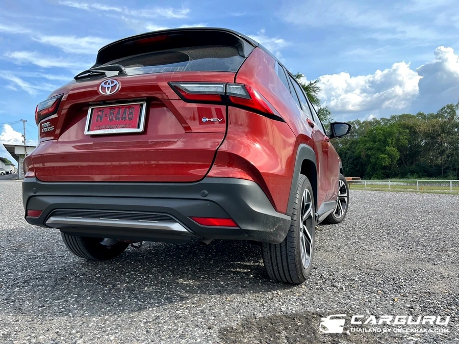 รีวิวทดลองขับ Toyota Yaris Cross Premium Luxury สิ่งแรกคือ รูปทรงภายนอกแล้วแต่มุมมองส่วนตัวยังรู้สึกว่าดูเป็นผู้ใหญ่ ดูบึกบึน ตัวรถที่ยกสูงระยะใต้ท้องราว ๆ 210 มม. ช่วยให้รู้สึกว่าคันใหญ่ขึ้นไปอีก ไฟหน้าดูโฉมเฉี่ยวแบบสปอร์ด ไฟท้ายคล้ายเล็กซัส ล้ออัลลอย 18 นิ้ว ลายเรียบ ๆ ยาง YOKOHAMA BluEarth-XT ดอกหนา ๆ ลุยได้นิดหน่อย มือจับประตูมีปุ่มที่ต้องกดทุกครั้งเมื่อจะเปิดประตู ยังไม่ใช่ระบบสัมผัส และมีไฟส่องมือจับตอนมืด ๆ ด้วย สีเป็นแบบทูโทน และออปชั่นเด่น ประตูท้ายไฟฟ้าพร้อมระบบ Kick-Activated ที่ใช้เท้ากวาดติดง่ายมาก ๆ พร้อมสวิตช์ล็อคประตูที่ฝาท้าย เหมือนในรถราคาสูงเลย