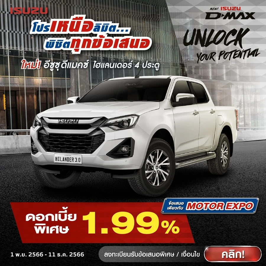 พบกับ NEW ISUZU D-MAX HI-LANDER เหนือลิมิต...พิชิตโลก ได้ที่โชว์รูมทั่วประเทศ (4 ประตู) พร้อมโปรโมชั่น ดอกเบี้ยพิเศษ 1.99% ซึ่งเป็นข้อเสนอเดียวกับในงาน MOTOR EXPO 2023 ระหว่างวันที่ 1 พ.ย. 2566 – 11 ธ.ค. 2566 โดยอ้างอิงอัตราดอกเบี้ย ณ เดือน พ.ย. - ธ.ค. 2566 ดอกเบี้ย 1.99% กรณีดาวน์ 25% ผ่อน 48 เดือน สำหรับรถยนต์รุ่น 4 ประตู (หมายเหตุ : เงื่อนไขเป็นไปตามสถาบันการเงินที่ร่วมรายการกับบริษัทฯ กำหนด / รายการส่งเสริมการขายนี้ไม่รวมรถรับจ้าง รถเช่า รถที่ซื้อภายใต้เงื่อนไขพิเศษอื่นๆ และรถที่ขายฟลีท / บริษัทฯ ขอสงวนสิทธิ์ในการเปลี่ยนแปลงเงื่อนไขโดยมิต้องแจ้งให้ทราบล่วงหน้า / เฉพาะผู้จำหน่ายอีซูซุที่ร่วมโครงการ)