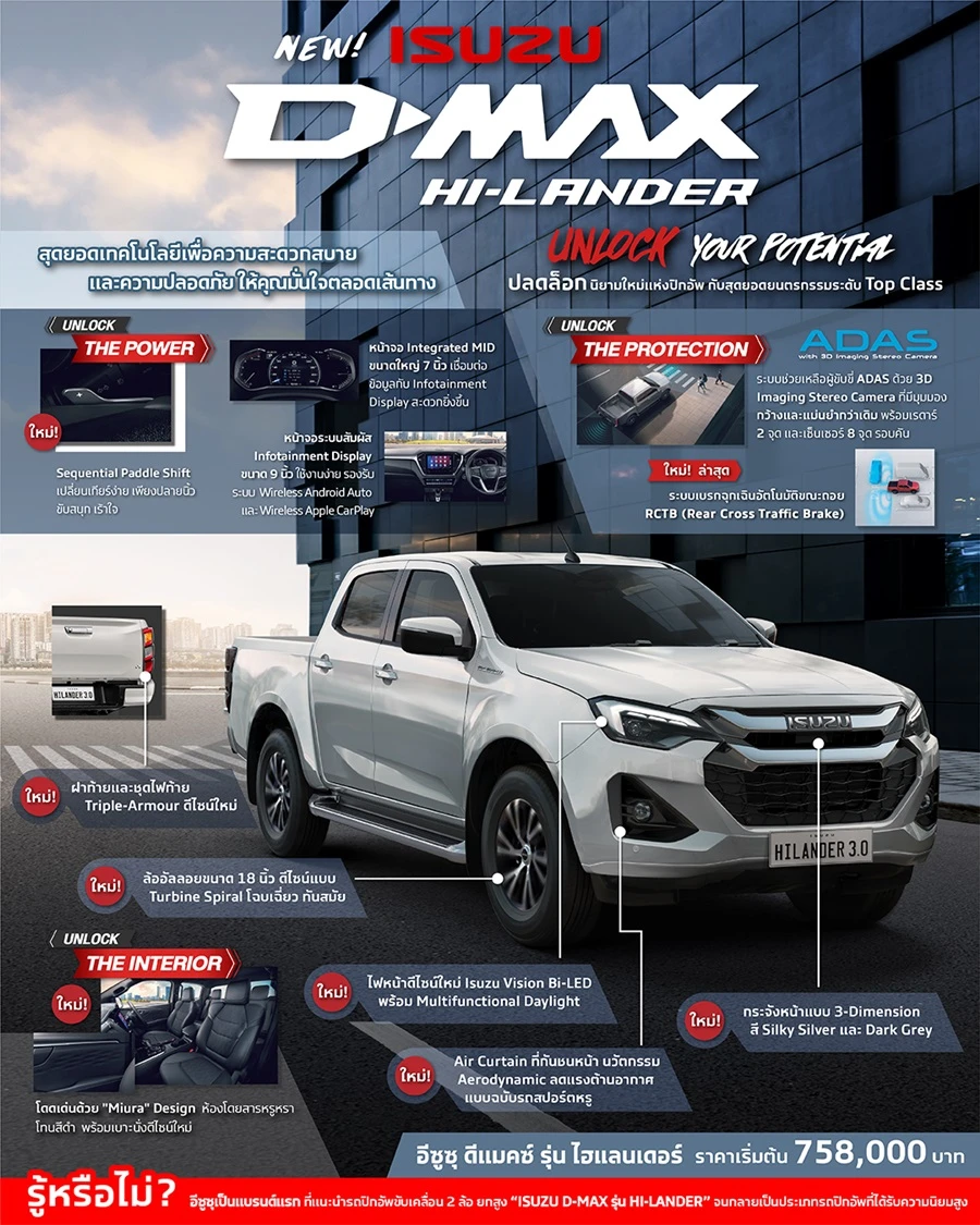 จนมาถึงการปรับโฉมล่าสุดกับ NEW ISUZU D-MAX HI-LANDER (อีซูซุ ดีแมคซ์ ไฮ-แลนเดอร์ 2023) ที่มากับนิยาม NEW! ISUZU D-MAX UNLOCK YOUR POTENTIAL หรือ ใหม่! อีซูซุ ดีแมคซ์ เหนือลิมิต…พิชิตโลก ที่จะมากับรถปิกอัพ ระดับ TOP CLASS ที่ผสมผสานความหรูหราเอาไว้อย่างลงตัว ด้วยดีไซน์ที่ประณีตใส่ใจในทุกรายละเอียด เช่น กระจังหน้าแบบ 3-Dimension, Air Curtain ที่กันชนหน้า นวัตกรรมแอโรไดนามิกที่ช่วบลดแรงต้านอากาศแบบรถสปอร์ต, ไฟหน้าดีไซน์ใหม่ พร้อม Mu;tifunctional Daylight, ล้ออัลลอยดีไซน์ใหม่ และไฟท้าย-ชุดฝาท้าย ดีไซน์ใหม่ ด้านการออกแบบภายในก็โดดเด่นด้วย Miura Design ด้านสมรรถนะการขับเคลื่อนจากเครื่องยนต์ 3.0 ดีดีไอ บลูเพาเวอร์ 190 แรงม้า กับ เครื่องยนต์ 1.9 ดีดีไอ บลูเพาเวอร์ เจน 2 150 แรงม้า นอกจากนี้ยังมีระบบความปลอดภัยที่เป็นนิยามใหม่ของรถปิกอัพด้วยความปลอดภัยระดับ Top Class อาทิ ระบบช่วยเหลือผู้ขับขี่ ADAS ด้วย 3D Imaging Stereo Camera ที่มีมุมมองกว้างขึ้นและแม่นยำกว่าเดิม พร้อมเรดาห์ 2 จุด และเซ็นเซอร์ 8 จุดรอบคัน และใหม่ล่าสุดกับ ระบบเบรกฉุกเฉินขณะถอย (รายละเอียดอาจจะแตกต่างกันไปตามรุ่นย่อยของรถปิกอัพ HI-LANDER)