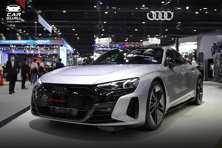 ถัดมาที่คันนี้ โดดเด่นเป็นสง่ามาก ๆ Audi RS e-tron GT ซูเปอร์คาร์ไฟฟ้า 100% ราคาเริ่มต้น 10,190,000 บาท ตัวรถมาพร้อมขุมพลังมอเตอร์ไฟฟ้าให้กำลังสูงถึง 598 แรงม้า และเพิ่มพลังสูงสุดใน boost mode ที่ 646 แรงม้า สามารถวิ่งได้ระยะทางสูงสุด 504 กม. ต่อการชาร์จ (มาตรฐาน NEDC)