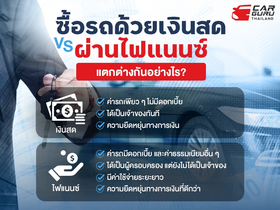 ก่อนอื่นเรามาดูกันก่อนว่าการซื้อรถด้วยเงินสด กับการซื้อรถผ่านไฟแนนซ์ แตกต่างกันอย่างไร? กันก่อน สำหรับคนที่ซื้อรถใหม่ก็จะเจอกับ 2 ทางเลือกคือซื้อด้วยเงินสด กับซื้อผ่านการจัดไฟแนนซ์ที่มีความแตกต่างกันในหลายด้าน มาเริ่มดูกันที่รถที่ซื้อด้วยเงินสดกันก่อน จะมีแต่ค่ารถเพียว ๆ ไม่มีดอกเบี้ยที่ต้องชำระเพิ่มเติมเหมือนอย่างรถที่ติดไฟแนนซ์ อีกทั้งได้เป็นเจ้าของรถยนต์ทันทีหลังจากที่การซื้อขายจบลง, ความยืดหยุ่นทางการเงินลดลงจากการจ่ายเงินสดเป็นก้อนใหญ่ อาจลดความยืดหยุ่นทางการเงินในระยะสั้นไปนั่นเอง ส่วนการซื้อรถยนต์ผ่านการจัดไฟแนนซ์ ขั้นแรกค่ารถมีดอกเบี้ย และค่าธรรมเนียมอื่นๆ เพราะทันทีที่การซื้อขายจบลงคุณเพียงจ่ายเงินดาวน์ และชำระค่างวดรายเดือนที่มีดอกเบี้ย แต่คุณจะได้เป็นเพียงผู้ครอบครอง แต่ยังไม่ได้เป็นเจ้าของเพราะรถยนต์คันนั้นจะมีบริษัทไฟแนนซ์เป็นเจ้าของรถจนกว่าคุณจะชำระหนี้เสร็จสมบูรณ์ และจะทำการโอนมาให้คุณ, ค่าใช้จ่ายเรียกว่าอยู่ในระยะยาว เพราะจะมีค่าใช้จ่ายเพิ่มเติม เพราะอาจมีค่าดอกเบี้ย และค่าธรรมเนียมที่เกี่ยวข้อง, ส่วนความยืดหยุ่นทางการเงินที่ดีกว่าการซื้อด้วยเงินสด เพราะการซื้อแบบนี้จะช่วยรักษาสภาพเงินสดเอาไว้ให้คุณสามารถมีกำลังการจับจ่ายในสิ่งอื่นและกระจายค่าใช้จ่ายในการซื้อรถออกเป็นระยะเวลานานตามข้อตกลง และได้รับข้อเสนอที่ดีกว่าซื้อเงินสด แต่...การเลือกระหว่างการซื้อรถด้วยเงินสดและการซื้อรถผ่านการจัดไฟแนนซ์ขึ้นอยู่กับสถานการณ์ทางการเงินส่วนบุคคลและความต้องการของคุณ ดังนั้นจึงควรที่จะพิจารณาในทุกด้าน และทำการวิเคราะห์ความสามารถในการจ่ายเงินของคุณเป็นสิ่งสำคัญด้วยนะครับ