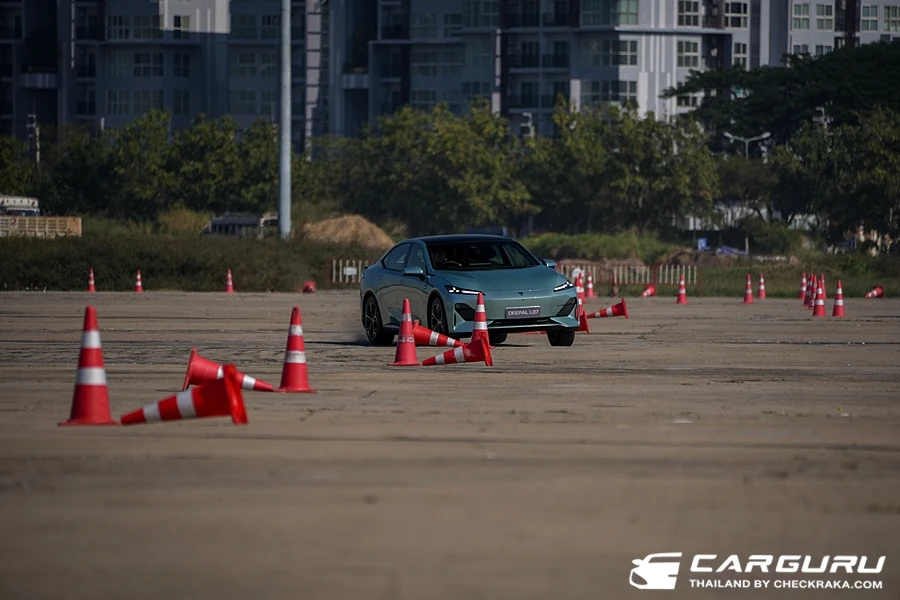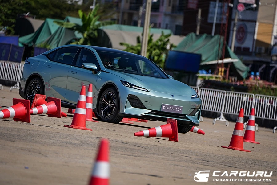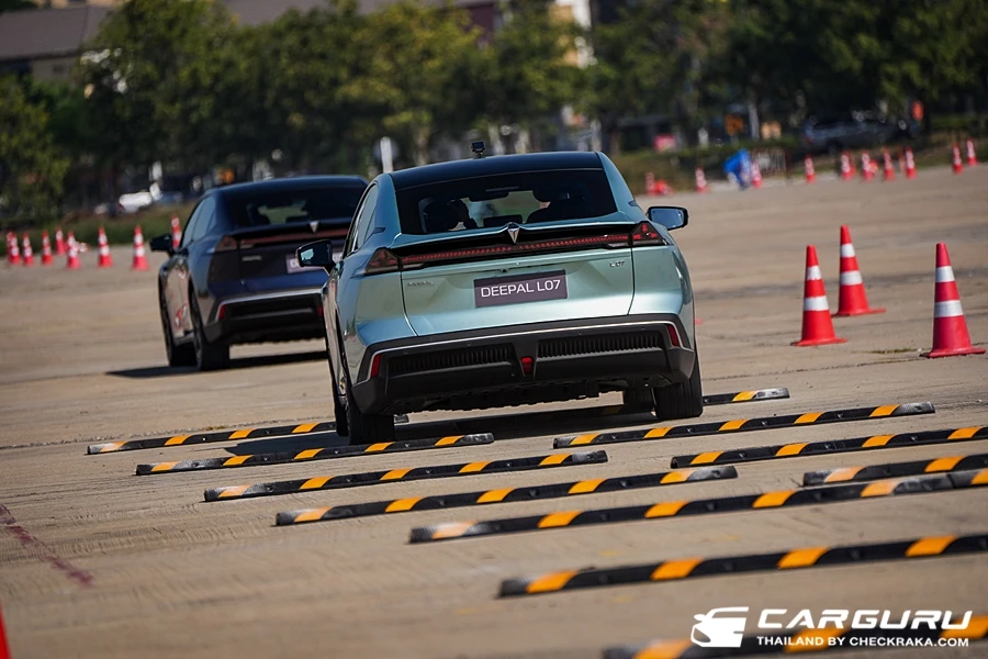 ในการทดสอบอัตราเร่งออกกตัว ทำได้ทันใจ ด้วยพลัง 258 แรงม้า แรงบิด 310 นิวตันเมตร ขับเคลื่อนล้อหลัง ให้ฟิวลิ่งสนุก เข้าสลาลอม มีอาการท้ายออกเล็กน้อย แต่ก็ยังเอาอยู่ ระบบเบรกค่อนข้างเบาเท้าใช้น้ำหนักน้อยก็เบรกได้หยุดสนิท หลังจากนั้นเข้าทางโค้งขวายาว ๆ ที่ความเร็วไม่เกิน 30 - 40 กม./ชม. และต่อเนื่องการสลาล่อมที่ความเร็วประมาณ 50 กม./ชม. มีเกินบ้าง โดย Deepal L07 จะมีความเกาะแน่นหนึบ และมีอาการท้ายออกน้อยกว่า ในรุ่น S07 ที่ตัวถังเป็นรถ SUV ยกสูง ยิ่งเมื่อเติมคันเร่งเพิ่ม อาการท้ายออกชัดเจนขึ้น เพราะเป็นรถขับเคลื่อนล้อหลัง แต่กลับทำให้ยิ่งสนุกและได้ฟิวลิ่งแบบรถยุโรปไปเลยครับ